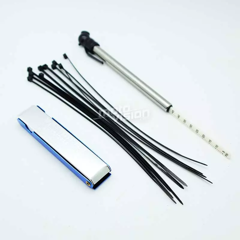 En su interior encontrará: un cepillo/espátula para guardabarros, 2 cepillos dobles de alambre pequeños, 1 cepillo doble pequeño, un juego de limas de limpieza de 0,6 a 0,26m, una herramienta de cepillo de alambre para tubos y roscas grandes, puntas metálicas, una herramienta manual para medir la presión de los neumáticos y rilsans.