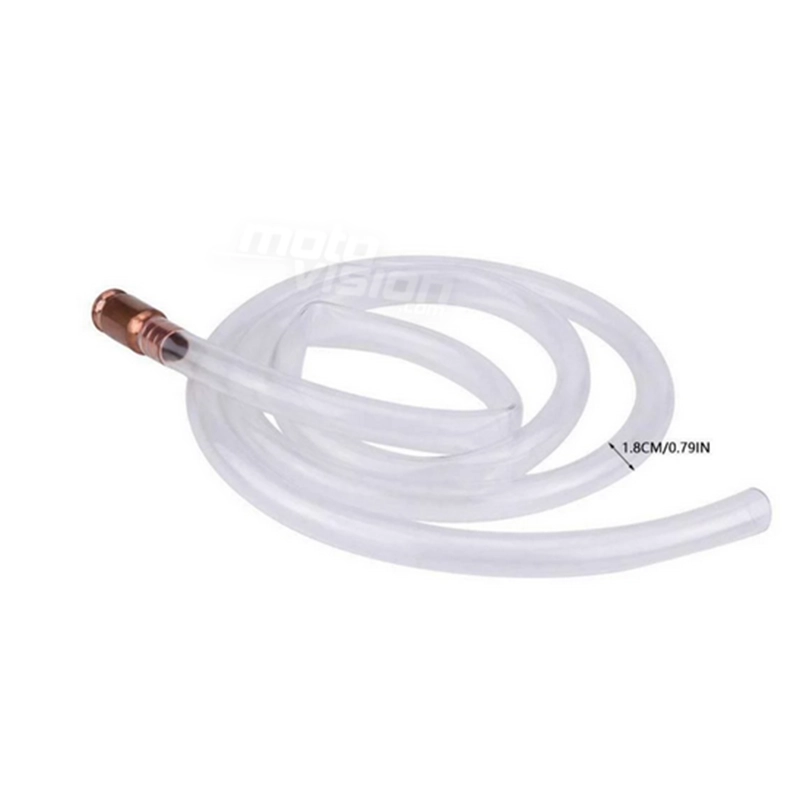 Tubo sifónico de PVC de 1,8 cm de diámetro y 180 cm de longitud. Ideal para sifonar aceite, combustible u otros fluidos de su moto, quad, tractor. Permite transferir fácilmente el combustible gracias a su sistema de autocebado con una boquilla de cobre sin plomo y una bola de vidrio.