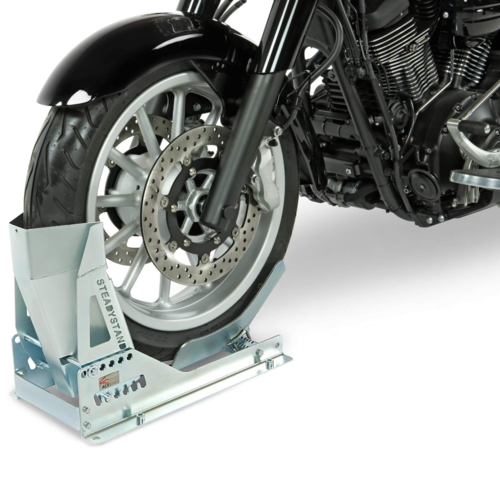 Puede mover la moto hacia delante en el bloqueo de rueda fijo SteadyStand Multi para bloquearla en posición vertical. Es el peso de la moto el que la mantiene firmemente inmovilizada. El último paso es colocar las correas en la moto para una seguridad total. El bloqueo de rueda fijo SteadyStand Multi ha sido ingeniosamente diseñado para ser ajustable sin herramientas. Este sencillo sistema de ajuste es perfecto si tiene varias motos y desea cambiar entre la rueda delantera y la trasera. El bloqueo de rueda fijo SteadyStand Multi es adecuado para neumáticos de 15 a 21 pulgadas, con una anchura de neumático de 90 a 200 mm.