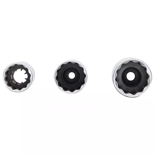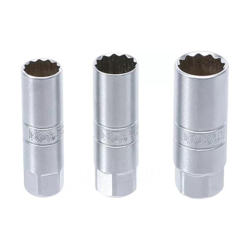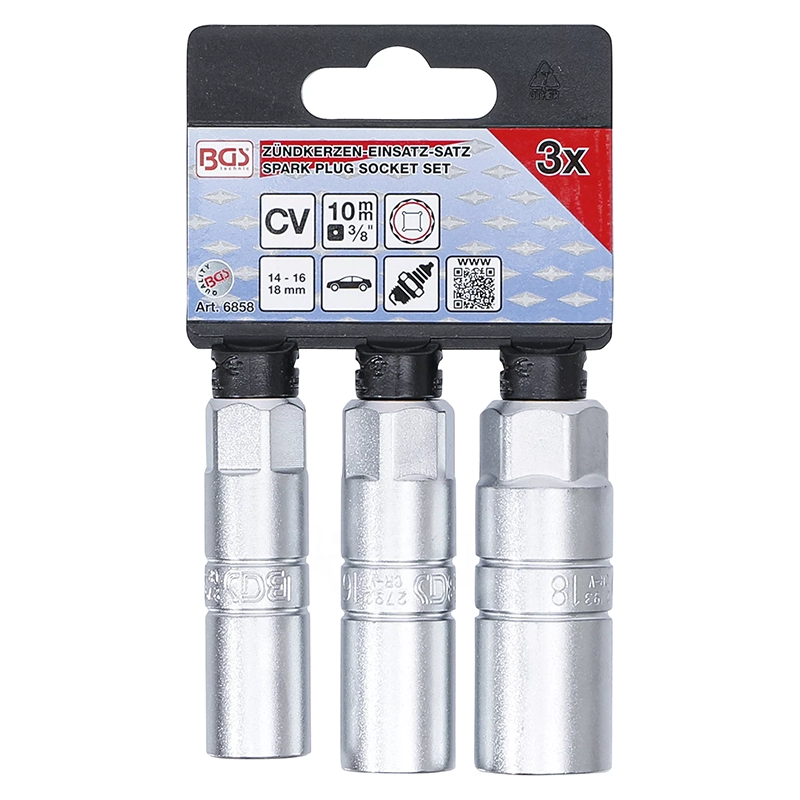 Juego de 3 vasos de bujía de acero cromado, de doce caras. Accionamiento mediante vaso cuadrado de 10 mm (3/8"). Paquete con piezas de 14 - 16 - 18 mm