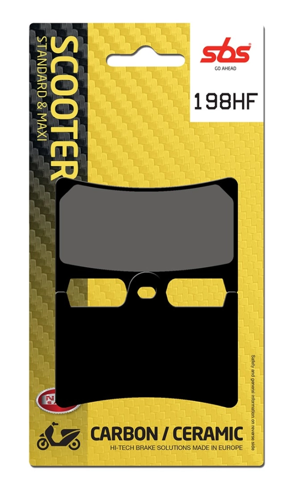 Pastillas de freno SBS 198HF(634) de la gama Street Organique, ideales para sustituir sus pastillas originales y proporcionar una frenada estable, un alto nivel de confort, una larga vida útil y protección de los discos en condiciones húmedas y secas para motos y scooters.