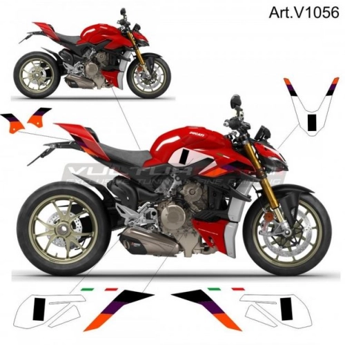 Personaliza tu moto con los Decoración personalizada compatible con Ducati Streetfighter V4 2020/2022. Los adhesivos decorativos Vulturbike están cortados en vinilo tintado estabilizado a los rayos UV.