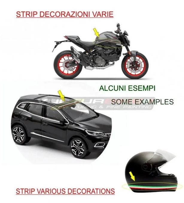 Personaliza tu moto con los Kit de pegatinas - rayas tricolores para varias decoraciones. Los adhesivos decorativos Vulturbike están cortados en vinilo tintado estabilizado a los rayos UV.