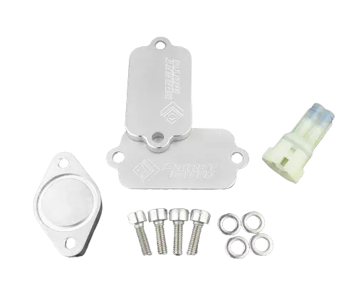 El kit de supresión de emisiones SmartMoto se compone de piezas mecanizadas CNC (las placas ciegas), combinadas con kits completos SmartMoto que proporcionan todos los componentes que necesita para eliminar el sistema de aire secundario.