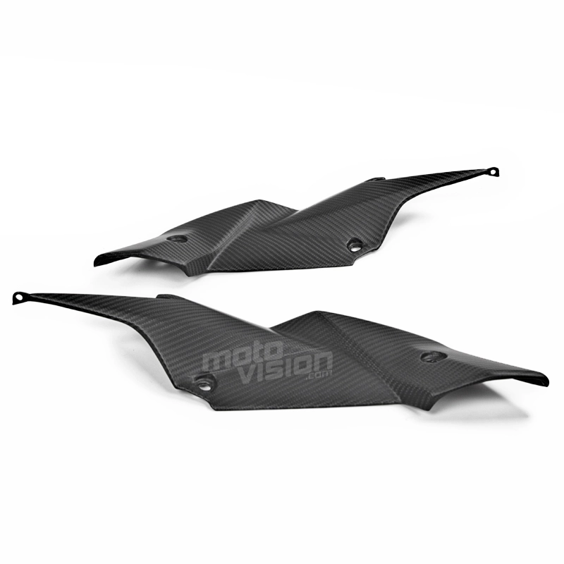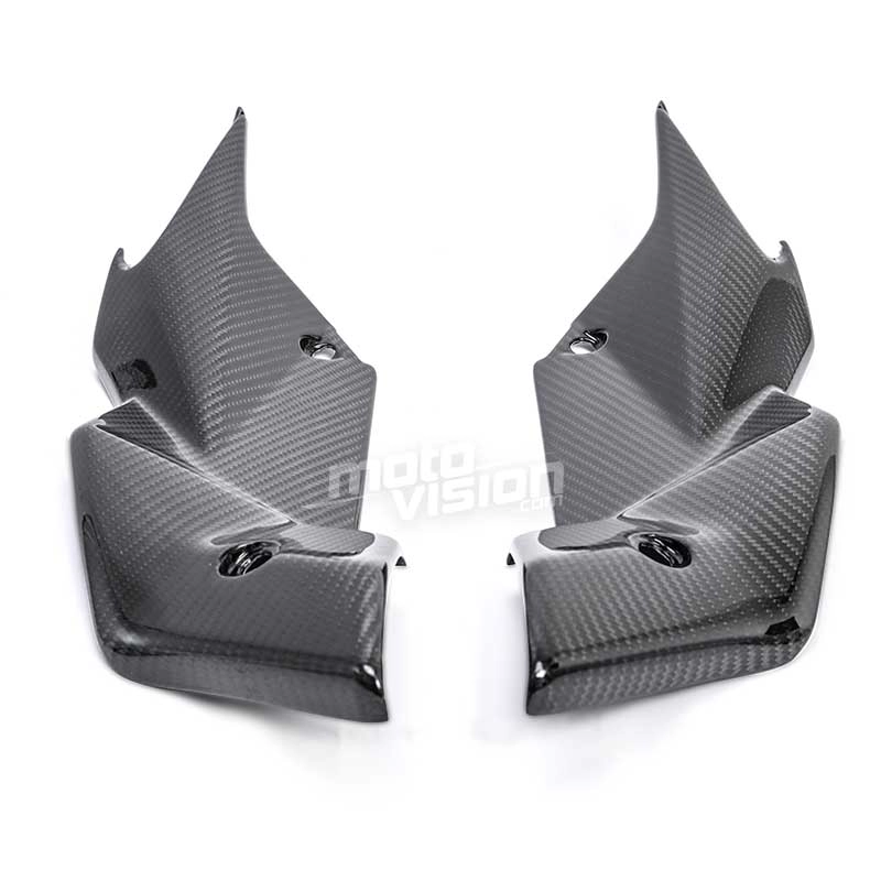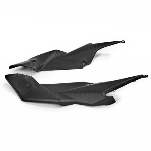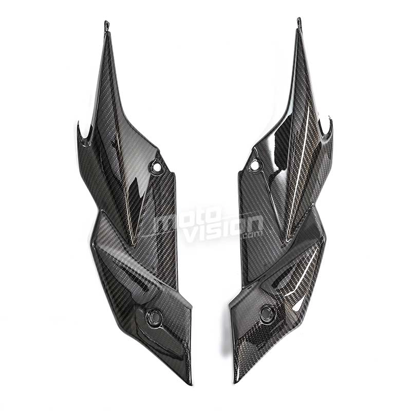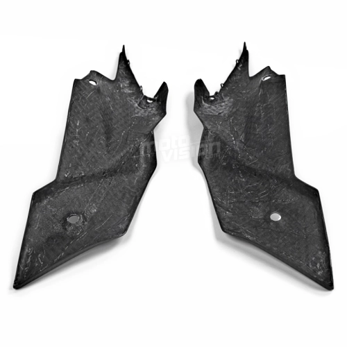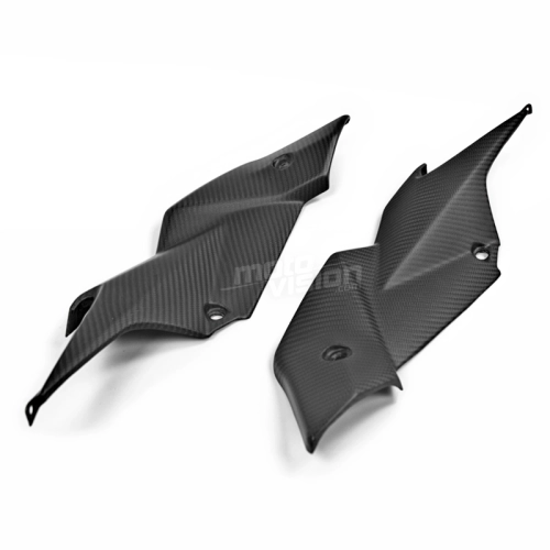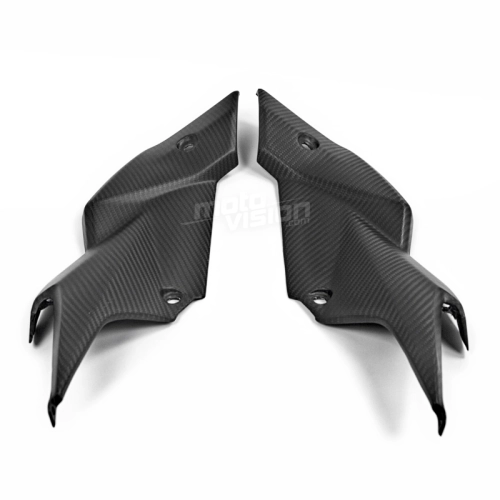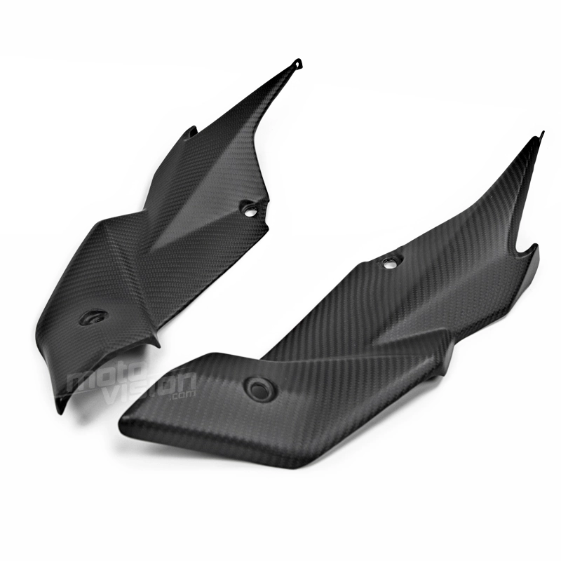 Protectores laterales de chasis en carbono Suzuki GSR 750 que se monta directamente en los puntos de fijación originales de su moto para sustituir el carenado original. Las piezas de carbono se entregan sin tornillos ni pernos.