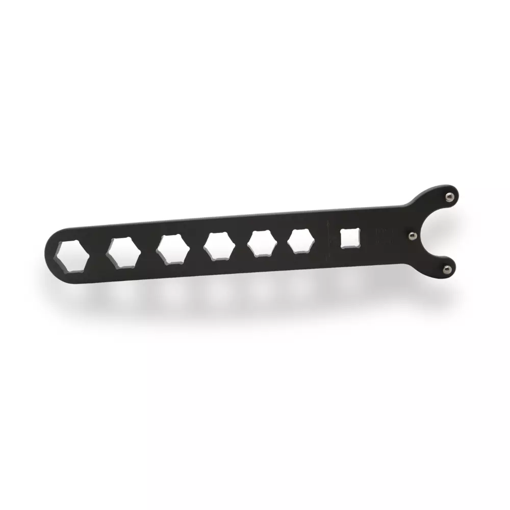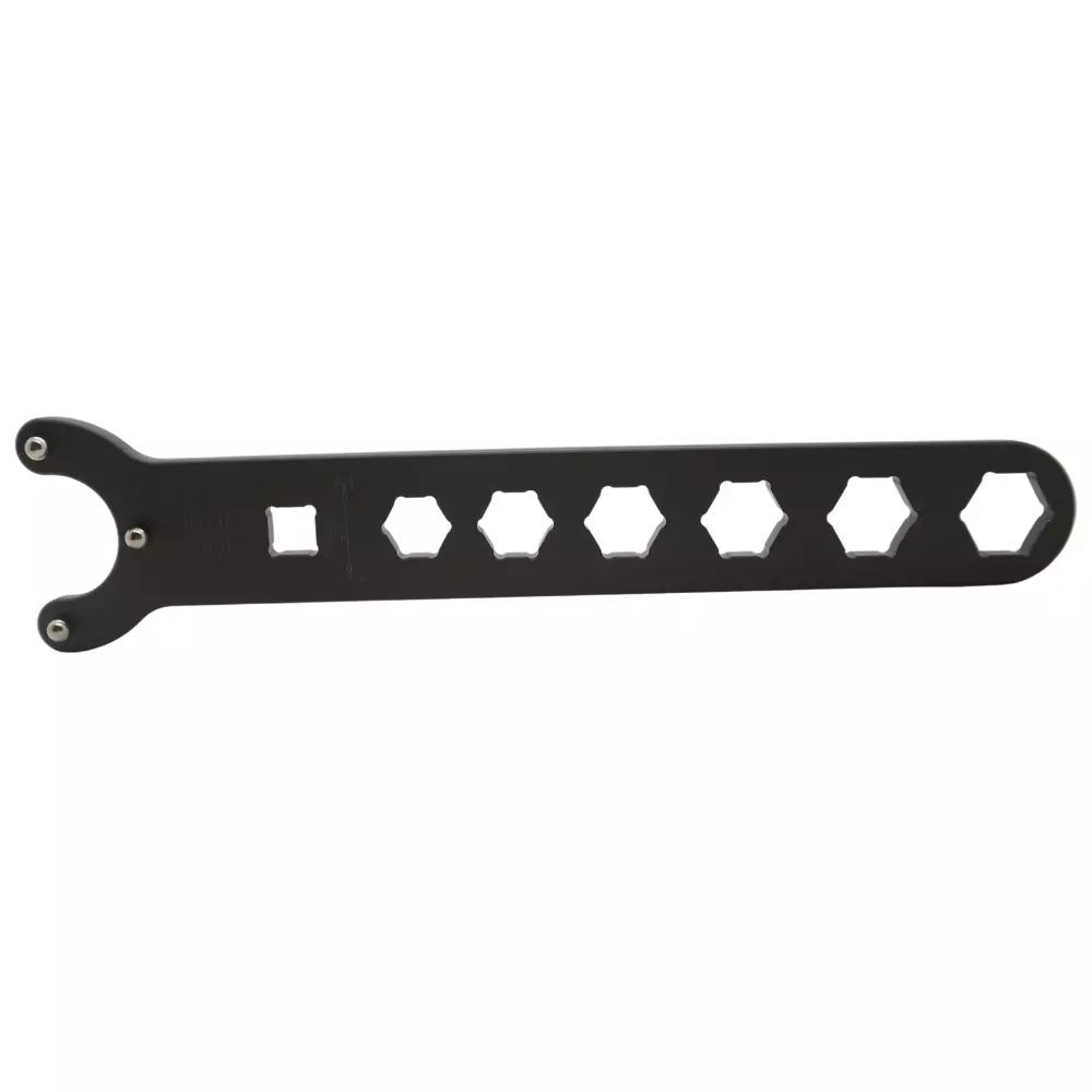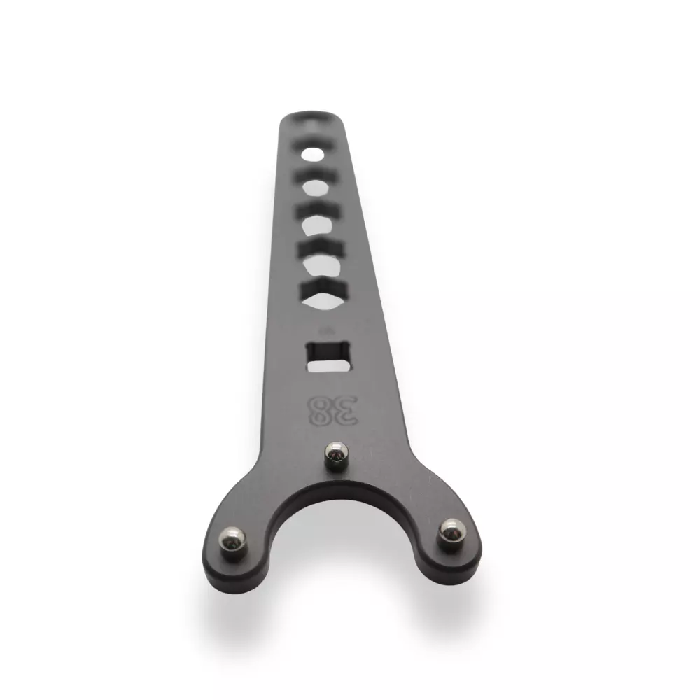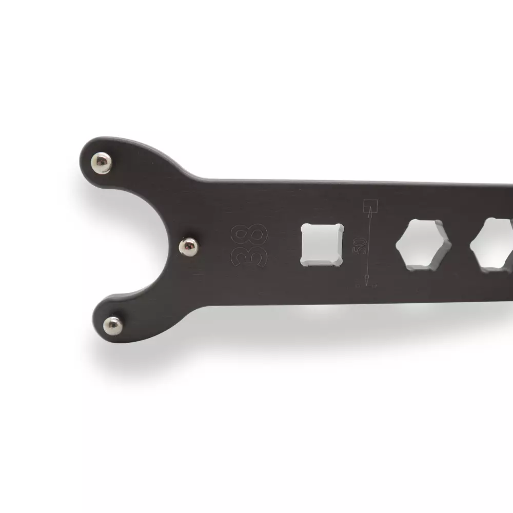 Llave de 38-4,8 mm para tapas de horquilla con tres fuertes pasadores para desmontar con precisión y seguridad las cabezas de los amortiguadores delanteros. Perfecta para el mantenimiento profesional.