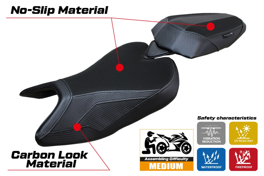 - Sistema de confort: Esta funda es, por fuera, exactamente igual a las demás fundas, pero está acoplada, por dentro, a una capa especial de 2,5 cm de espuma viscoelástica. Tappezzeria Italia es el único fabricante que utiliza la tecnología Memory Foam, que mejora el confort de conducción reduciendo la fatiga y las vibraciones de la moto.