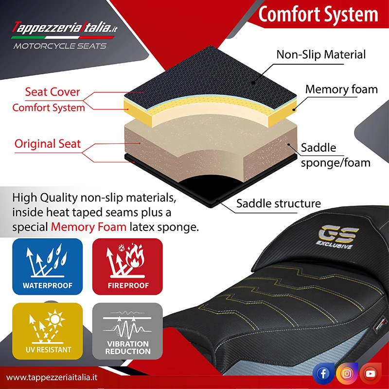 - Sistema de confort: Esta funda es, por fuera, exactamente igual a las demás fundas, pero está acoplada, por dentro, a una capa especial de 2,5 cm de espuma viscoelástica. Tappezzeria Italia es el único fabricante que utiliza la tecnología Memory Foam, que mejora el confort de conducción reduciendo la fatiga y las vibraciones de la moto.