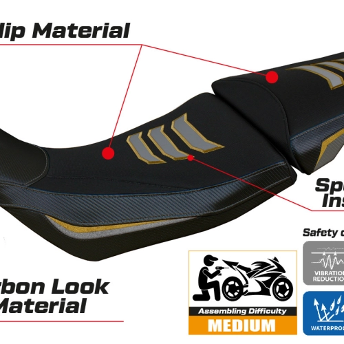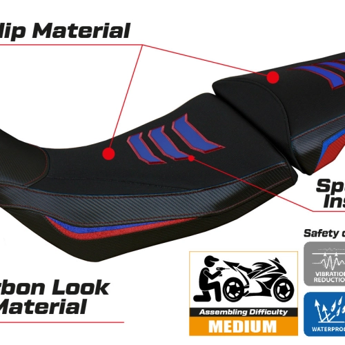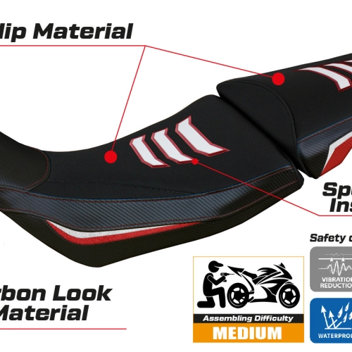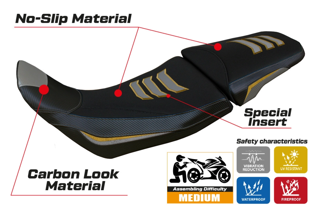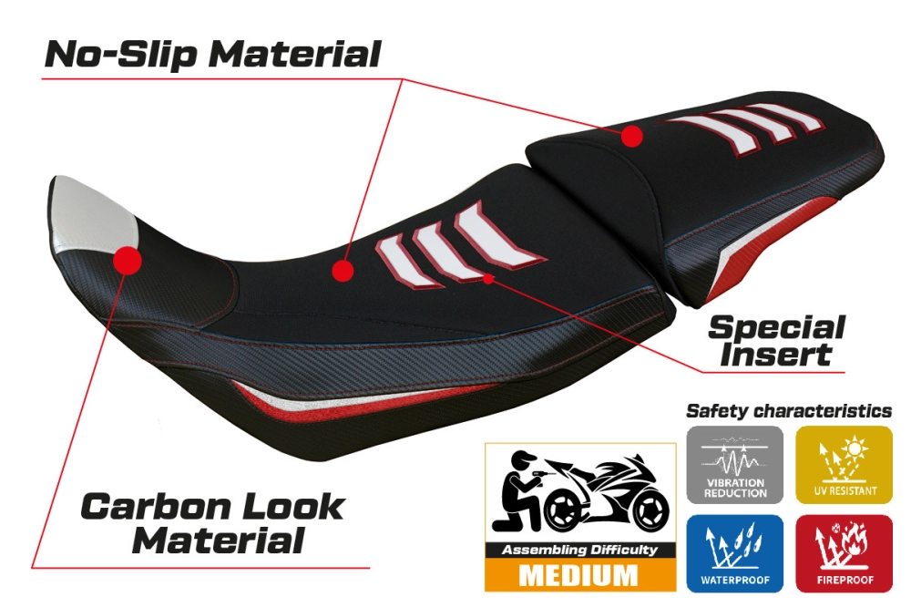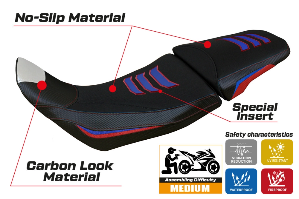 - Sistema de confort: Esta funda es, por fuera, exactamente igual a las demás fundas, pero está acoplada, por dentro, a una capa especial de 2,5 cm de espuma viscoelástica. Tappezzeria Italia es el único fabricante que utiliza la tecnología Memory Foam, que mejora el confort de conducción reduciendo la fatiga y las vibraciones de la moto.