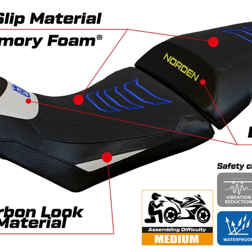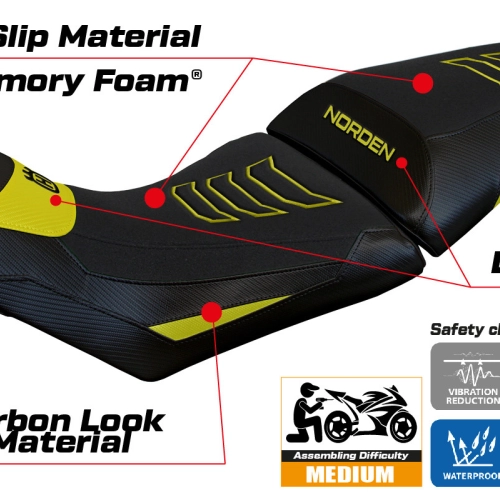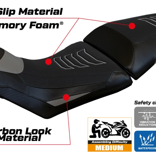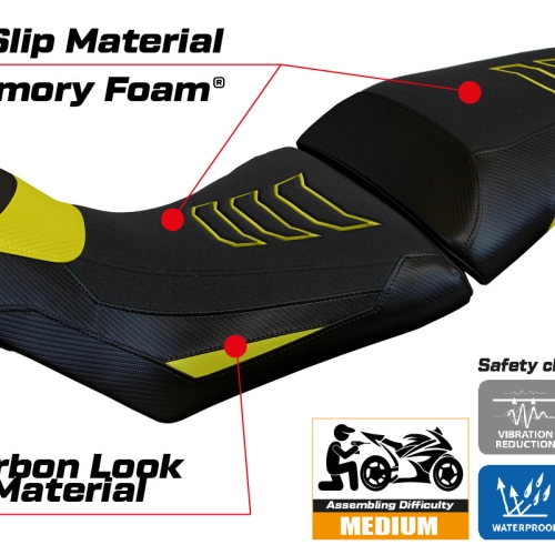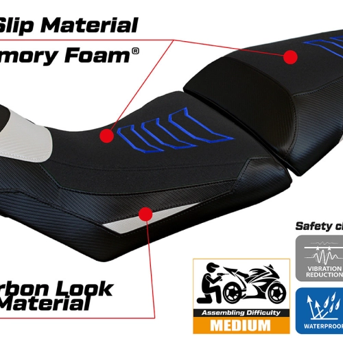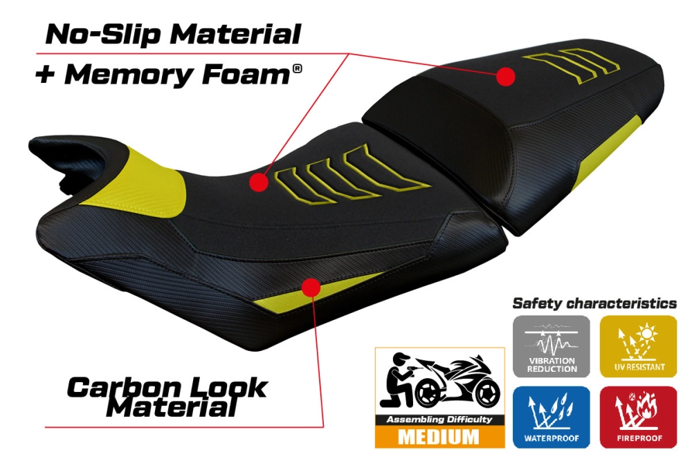 - Sistema de confort: Esta funda es, por fuera, exactamente igual a las demás fundas, pero está acoplada, por dentro, a una capa especial de 2,5 cm de espuma viscoelástica. Tappezzeria Italia es el único fabricante que utiliza la tecnología Memory Foam, que mejora el confort de conducción reduciendo la fatiga y las vibraciones de la moto.