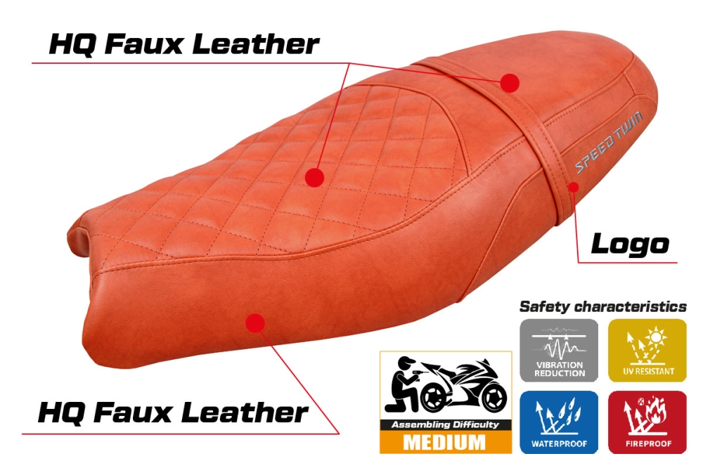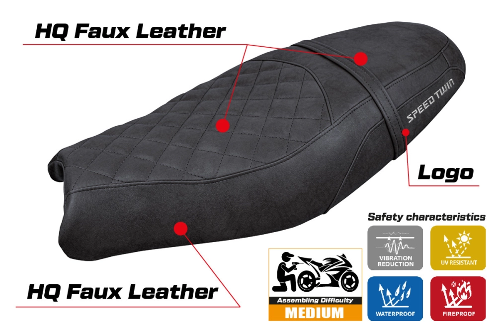 La Funda de asiento Tappezzeria TRIUMPH SPEED TWIN 900 (19-24) modele Wembley te permite cambiar fácilmente el aspecto del asiento original de tu moto. Tiene las características técnicas esenciales para una funda de asiento de moto de calidad: impermeable y resistente al sol, costuras dobles reforzadas y alta resistencia a los productos químicos.