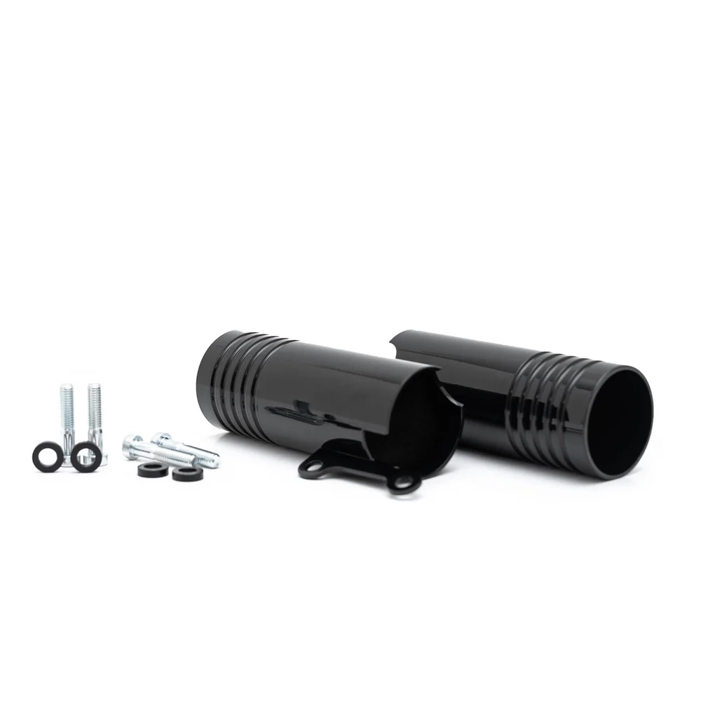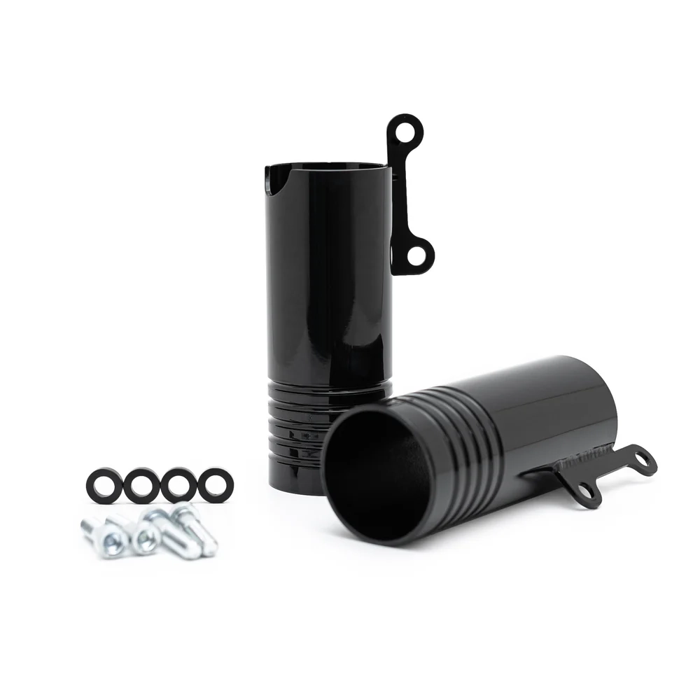 Los tapones se fijan con el guardabarros delantero y la pinza de freno para un ajuste seguro. Acabado en polvo negro brillante.