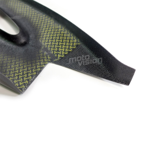 - Un acabado de tejido de carbono muy atractivo que dará a su moto el aspecto «racing» utilizado en competición. El interior de la pieza está pintado de negro mate con el Kevlar visible.