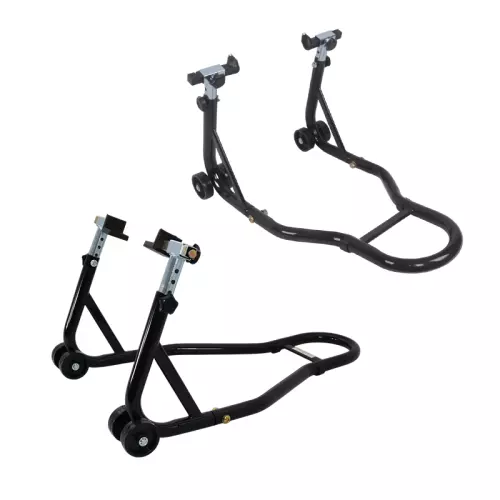 Juego de caballetes delantero y trasero ajustables en altura, para realizar todo tipo de trabajos de mantenimiento: cambio de aceite, sustitución de ruedas, engrase de la cadena, hibernación y limpieza general.