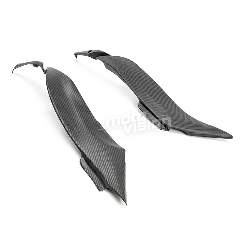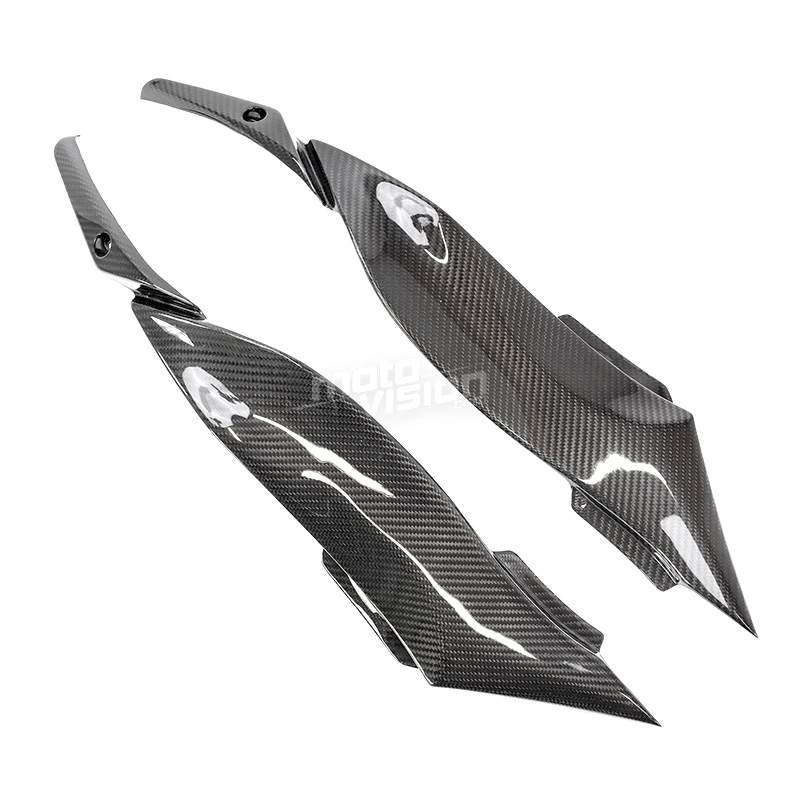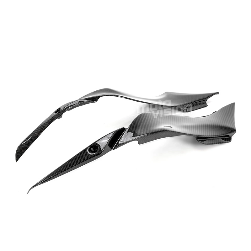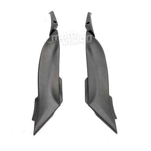 Paire de caches sous reservoir carbone Kawasaki ZX6 2009-2012, livré sans visserie ou autres fixations. Les perçages sont déjà effectués sur les carénages moto en carbone.