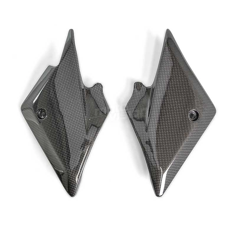 Paire de caches sous selle Carbone Suzuki SV 1000 2004-2010, livré sans visserie ou autres fixations. Les perçages sont déjà effectués sur les carénages moto en carbone.