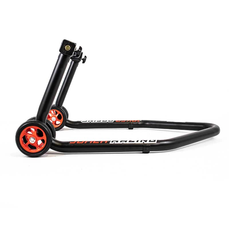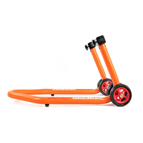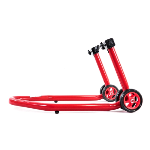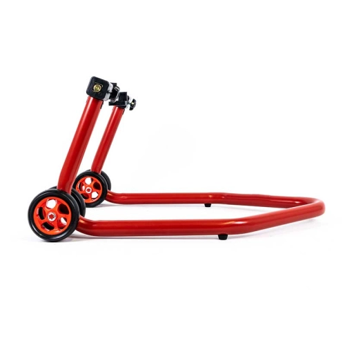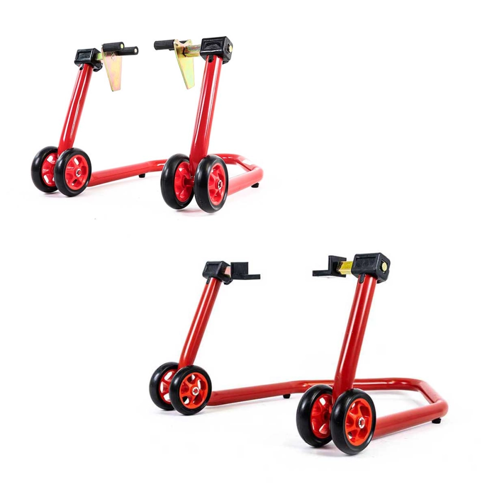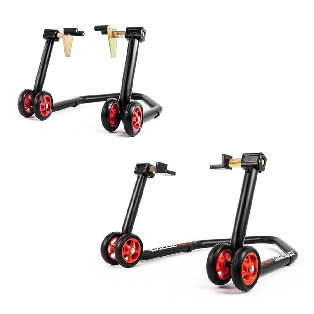 Lot de béquilles avant et arrière en une partie très rigide avec de grandes roues pour faciliter les déplacements, elle soulève la moto sous les tubes de fourches ou par le bras oscillant