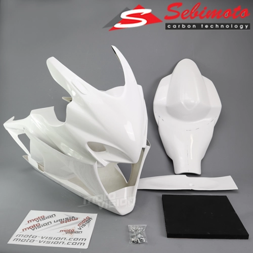 Sebimoto est un fabricant européen avec 35 années d’expérience et un produit en fibre de verre pour moto milieu de gamme. Le kit complet carénage Sebimoto SUZUKI GSXR 1000 2007-08 est réalisé avec de très bons matériaux, sans gros défauts d’apparence (nécessite tout de même une mise en peinture) et avec un ajustement correct.