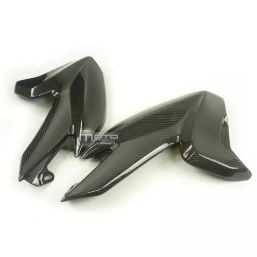 Paire de flancs de reservoir carbone Ducati Hyperstrada Hypermotard 2013-2018, livré sans visserie ou autres fixations. Les perçages sont déjà effectués sur les carénages moto en carbone.