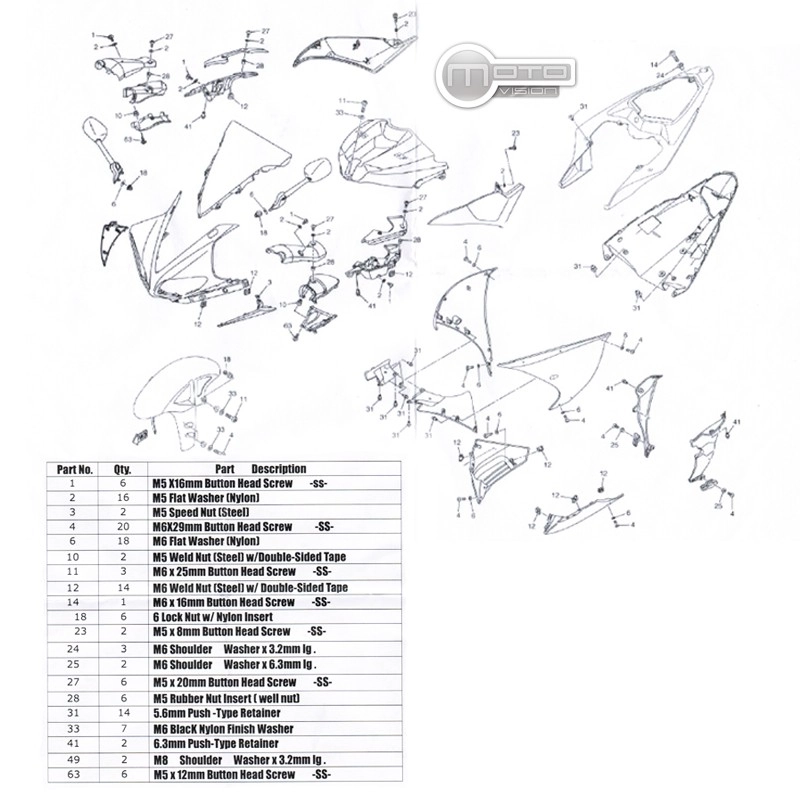 Le kit contient le nécessaire en vis, écrous, rondelles, contre écrous, rivets, clips en plastique (...) pour pouvoir remonter un carénage ABS identique à l'origine.