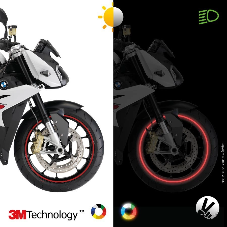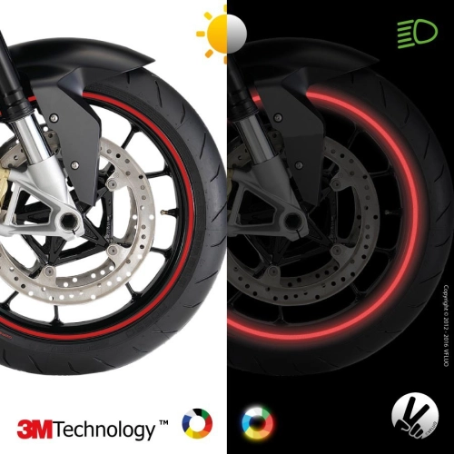 Conçues pour une pose facile sur les jantes de la moto, les bandes en amélioreront l'esthétique tout en vous apportant la visibilité latérale qui manque avec les seuls feux avant et arrière.