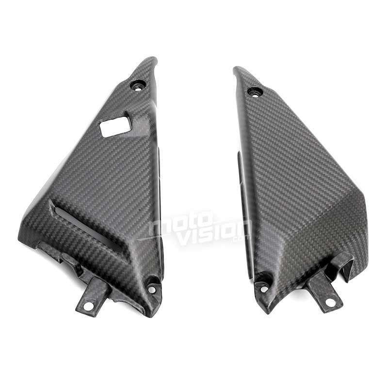 Caches latéraux sous selle carbone vernis Kawasaki Ninja 650 et Z650 2017-... à monter directement sur les points de fixation d'origine de votre moto en remplacement du carénage d'origine. Les pièces en carbone sont livrées sans visserie.