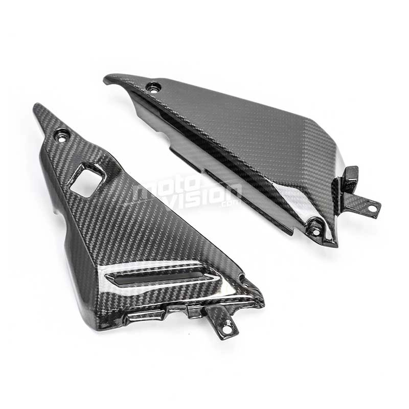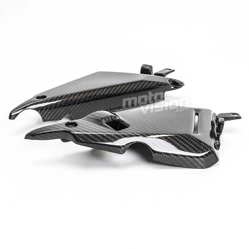 Caches latéraux sous selle carbone vernis Kawasaki Ninja 650 et Z650 2017-..., livré sans visserie ou autres fixations. Les perçages sont déjà effectués sur les carénages moto en carbone.