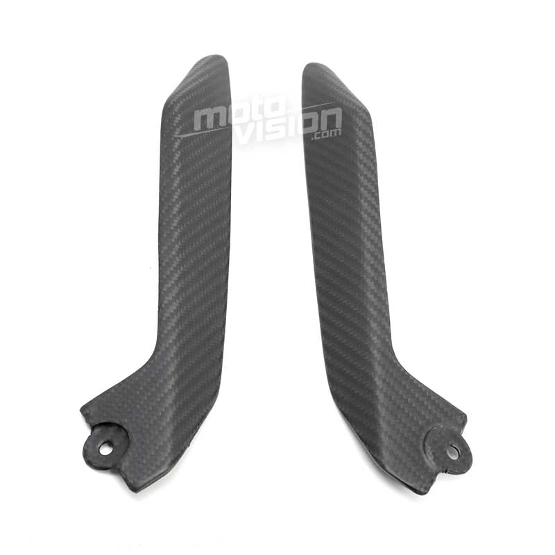 Caches avant bas (V de carénage) carbone mat Kawasaki Ninja 650 2017-..., livré sans visserie ou autres fixations. Les perçages sont déjà effectués sur les carénages moto en carbone.