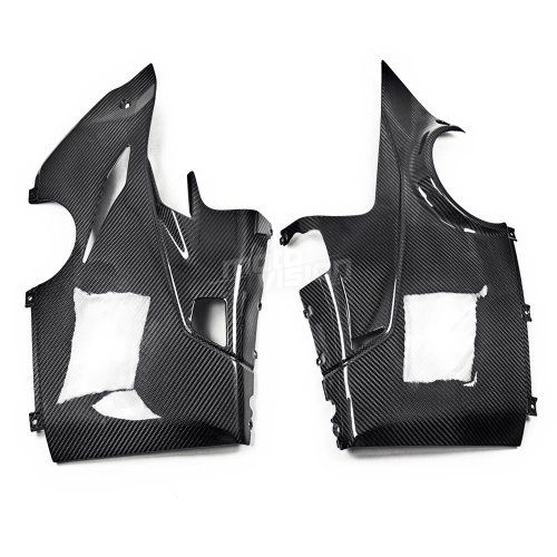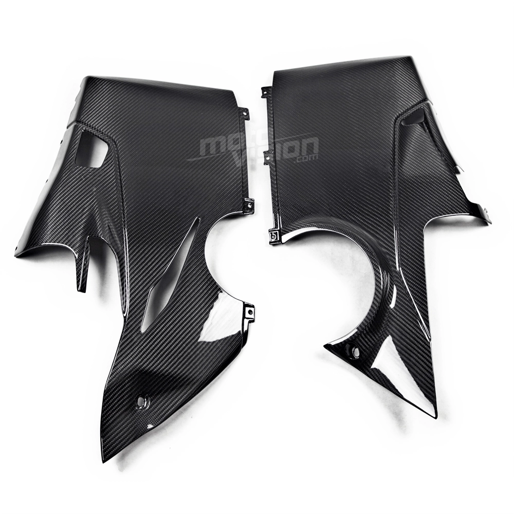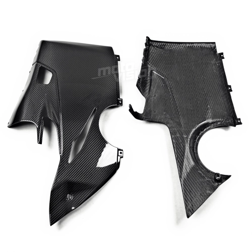 Flanc de carénage carbone brillant Ducati Panigale V4 ligne d'origine, livré sans visserie ou autres fixations. Les perçages sont déjà effectués sur les carénages moto en carbone.