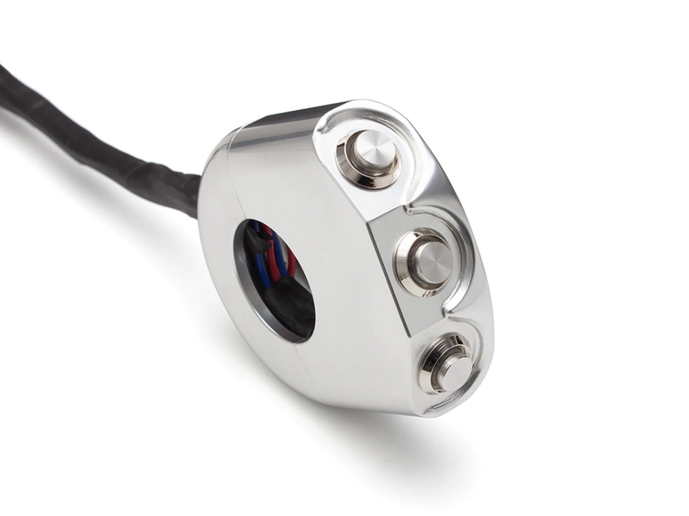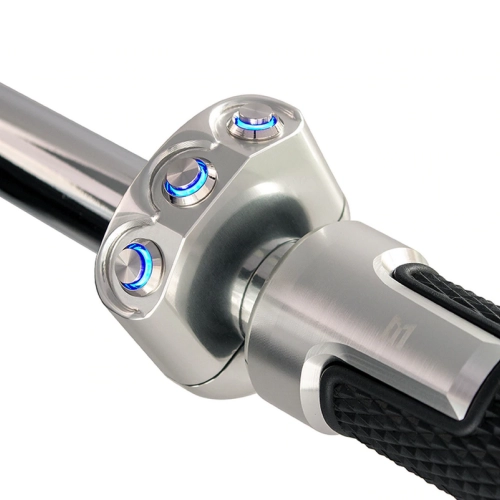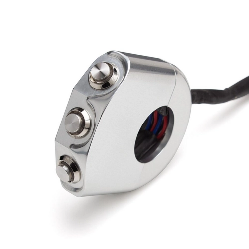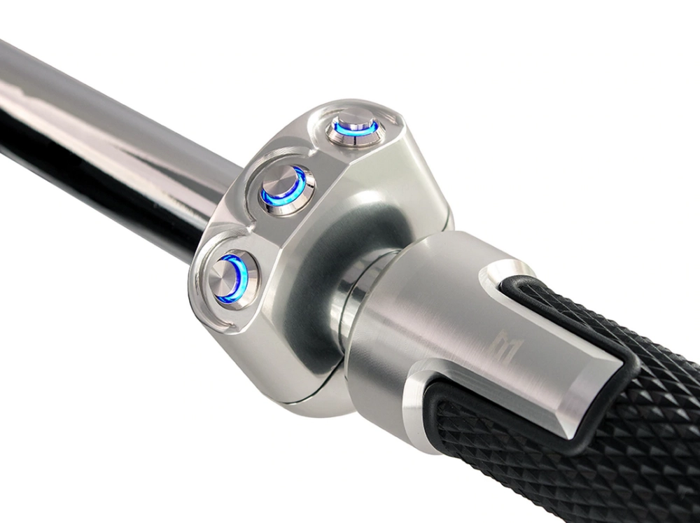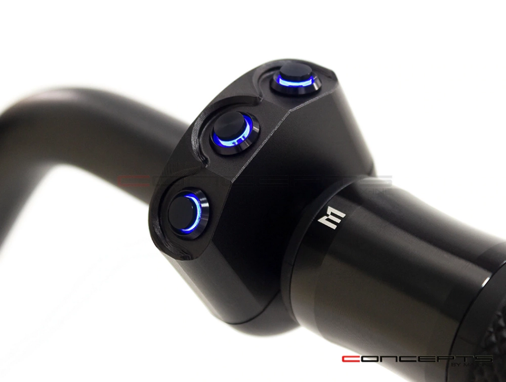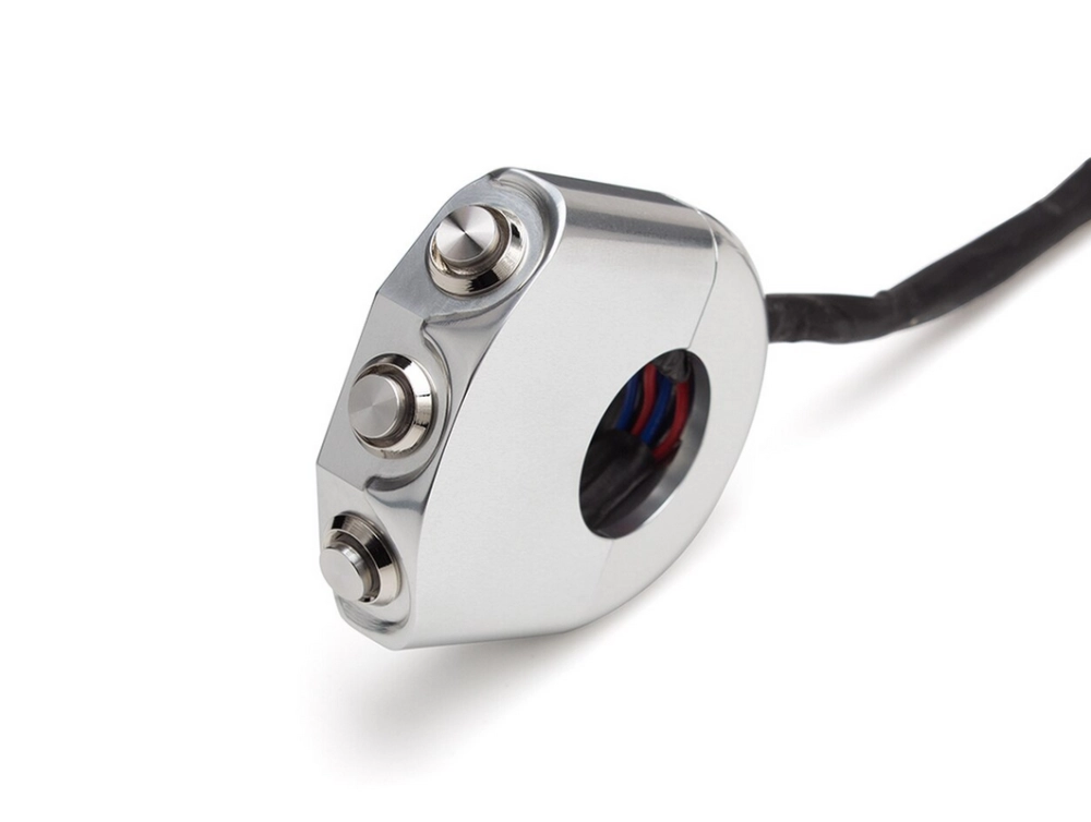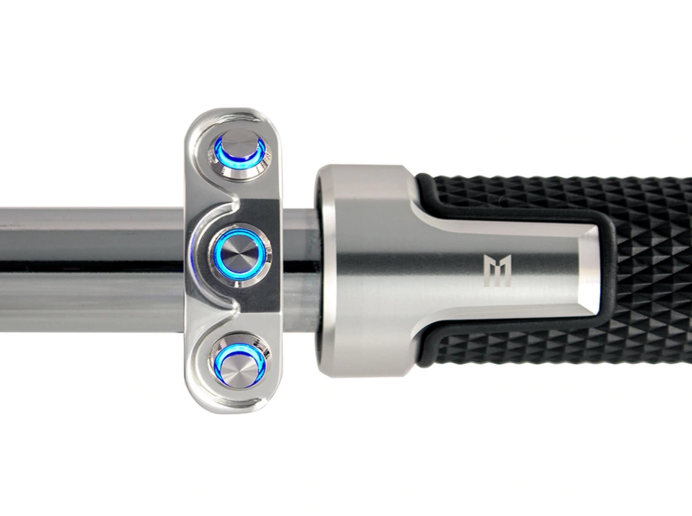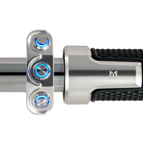 Commodo usiné aluminium CNC avec 3 boutons poussoirs rétroéclairés. Cet interrupteur peut être monté sur le côté gauche ou droit de votre guidon simplement en le basculant.