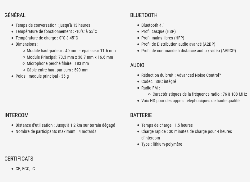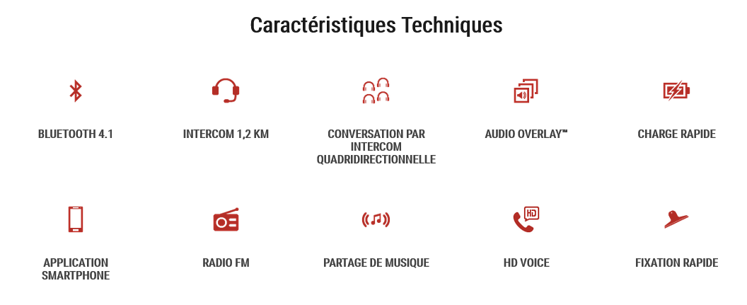 • Bluetooth 4.1 • Radio FM • Fixation rapide • Intercom 1,2 km • Conversation par intercom quadridirectionnelle