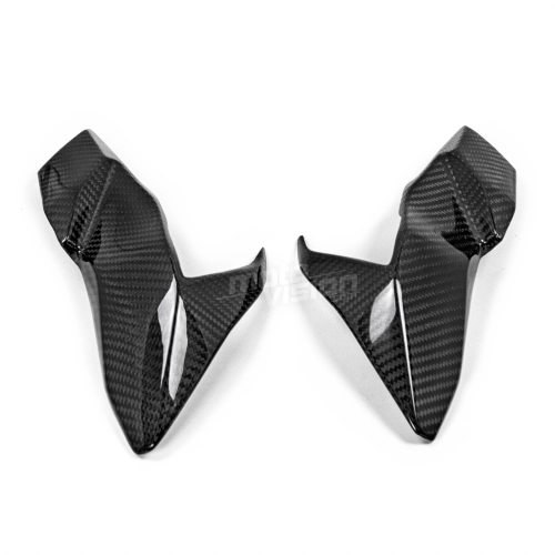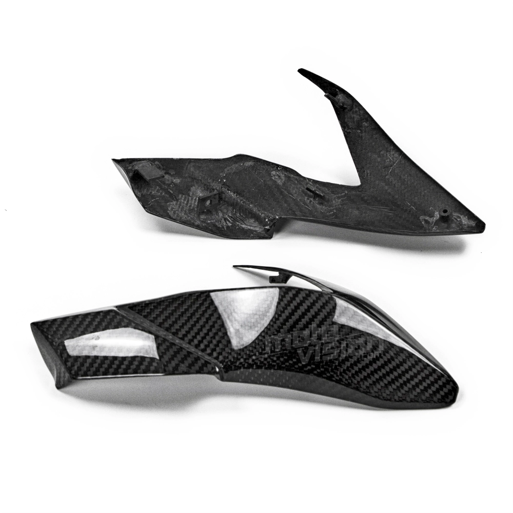Paire de caches sous selle carbone Kawasaki Z650 2017-2019, livré sans visserie ou autres fixations. Les perçages sont déjà effectués sur les carénages moto en carbone.