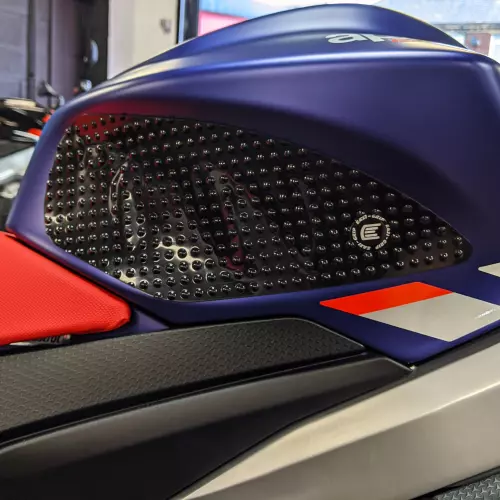 Grip de réservoir moto adhésif et antidérapant de la gamme Evo de Eazi-grip, prédécoupé spécifiquement pour APRILIA RS660/Tuono 660 2021+. Le produit est conçu pour vous donner un meilleur contrôle de votre moto en phase d'accélération ou de freinage tout en réduisant votre fatigue.