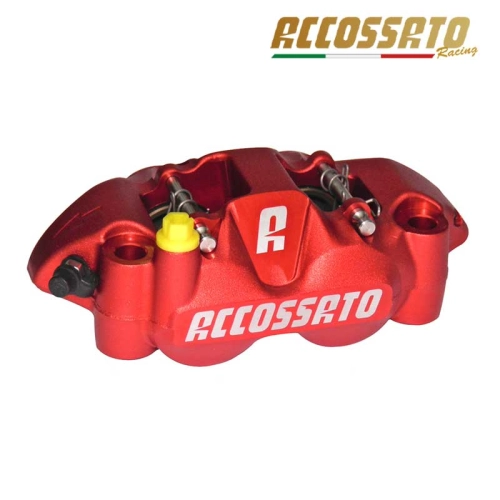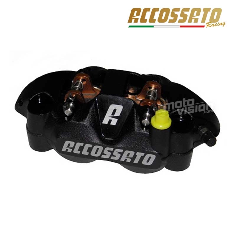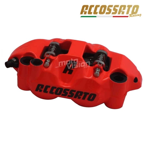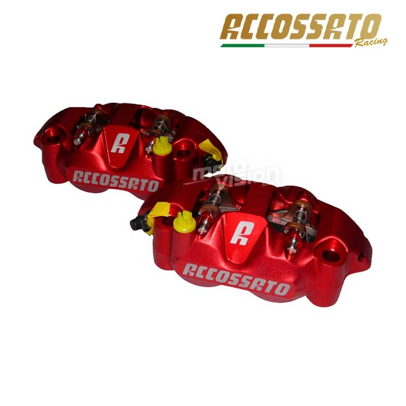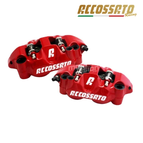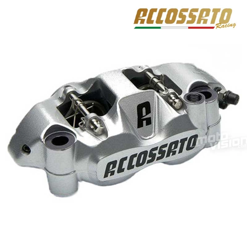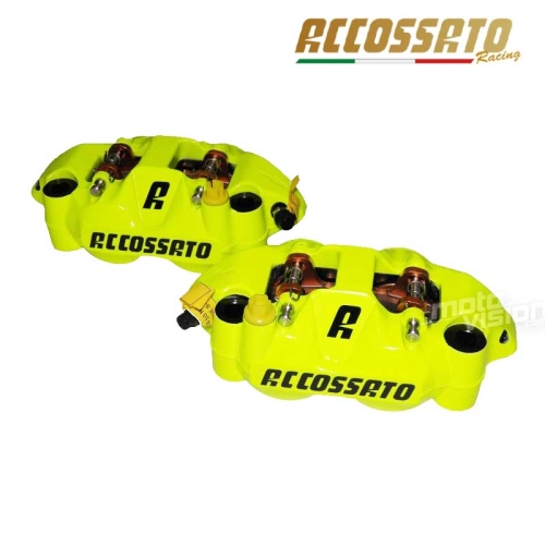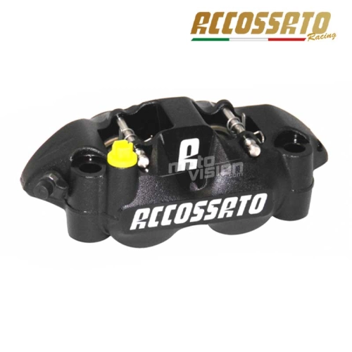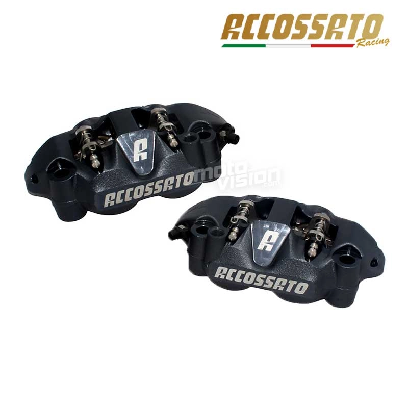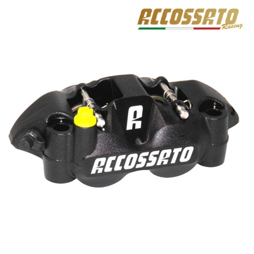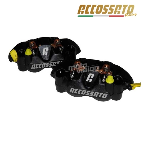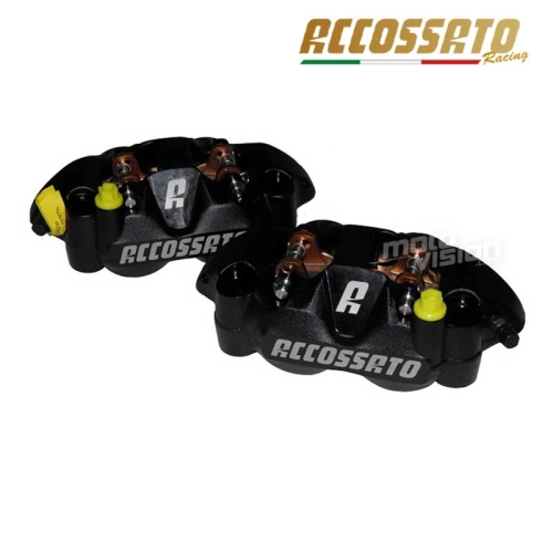 Les étriers avant radial monobloc Accossato sont vendus par paire, où à l'unité (gauche ou droite). Ils sont livrés avec des plaquettes en métal fritté de type ZXC et des caches poussières. Les étriers en aluminium forgé sont conçus pour les entraxes de 108 mm, avec 4 pistons en aluminium (34mm) et un offest de 22,5 mm.