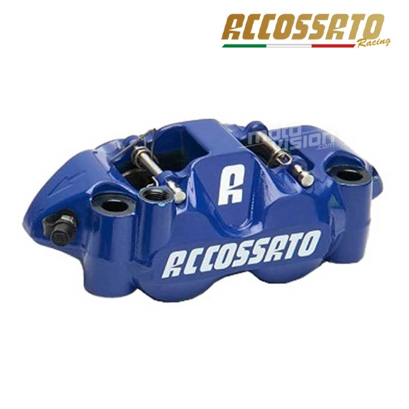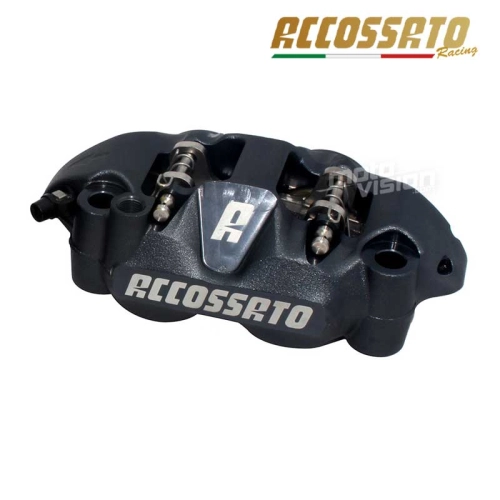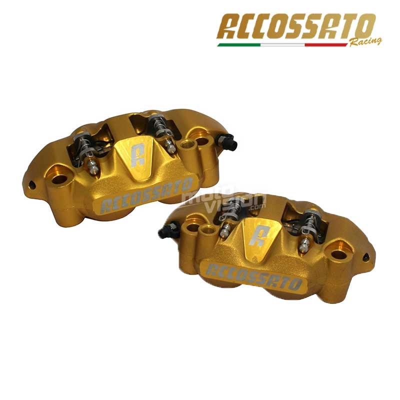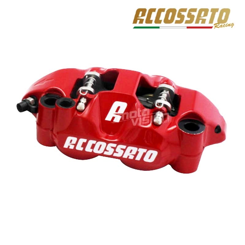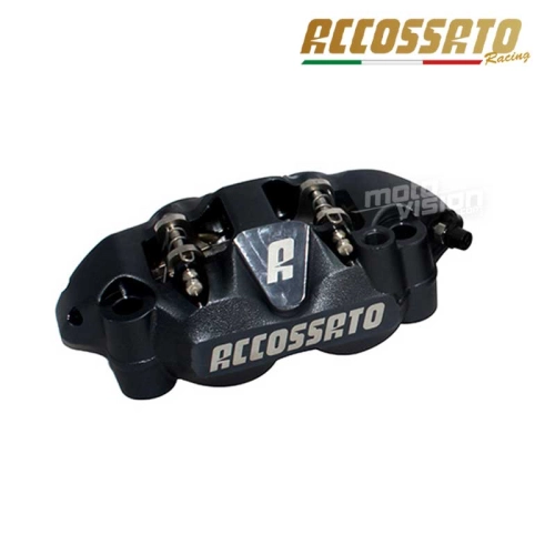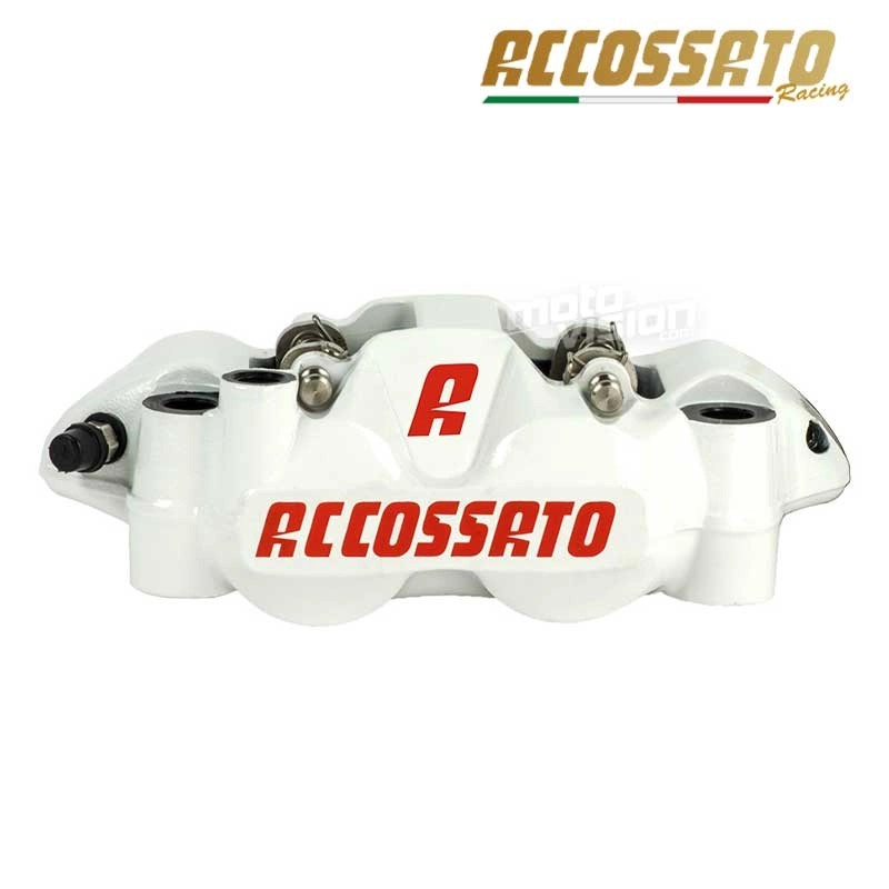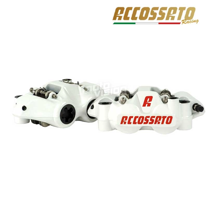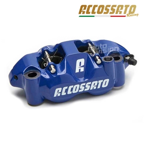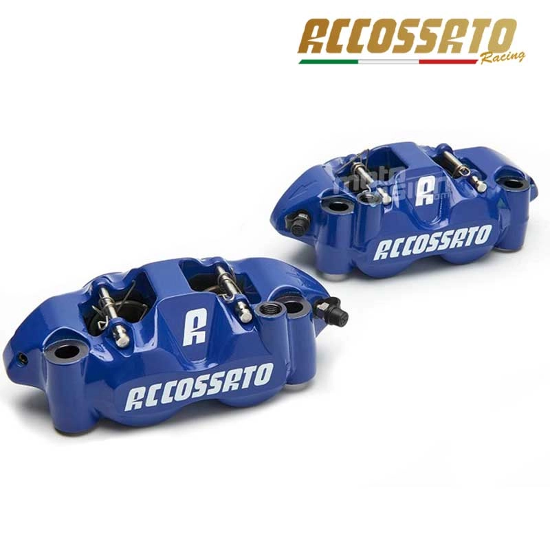 Les étriers avant radial monobloc Accossato sont vendus par paire, où à l'unité (gauche ou droite). Ils sont livrés avec des plaquettes en métal fritté de type ZXC et des caches poussières. Les étriers en aluminium forgé sont conçus pour les entraxes de 108 mm, avec 4 pistons en aluminium (34mm) et un offest de 22,5 mm.