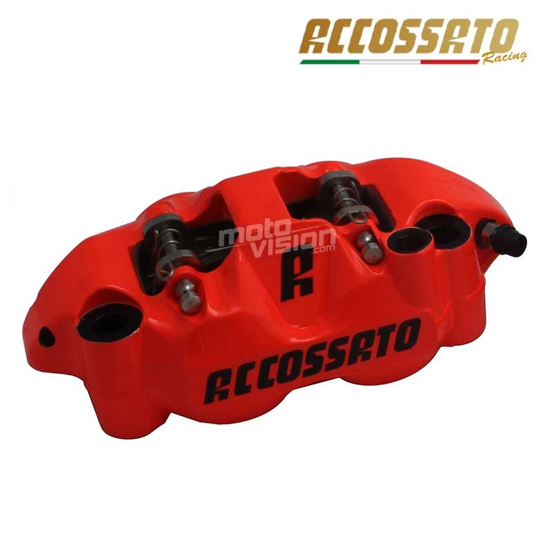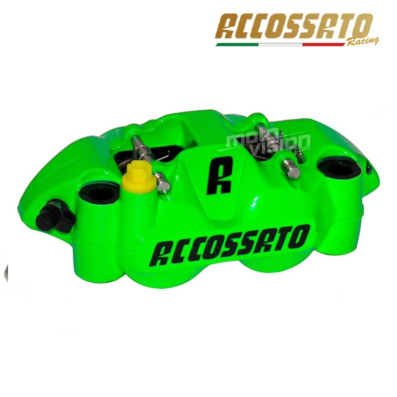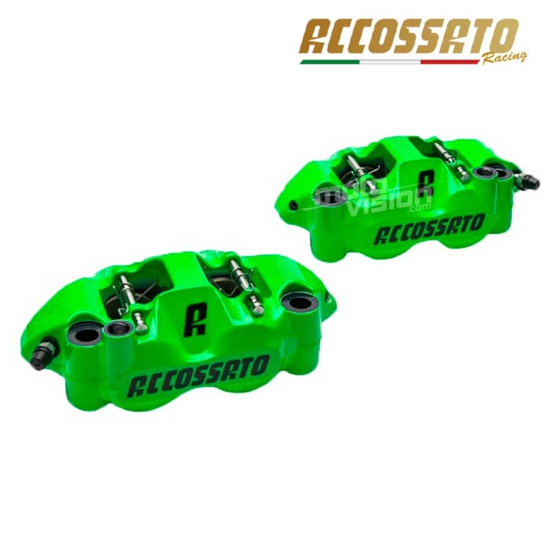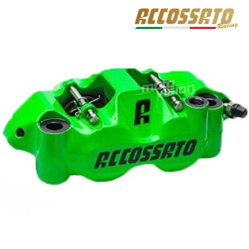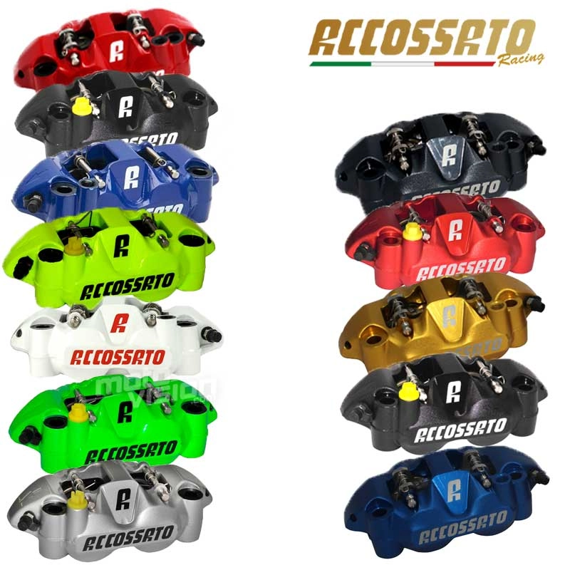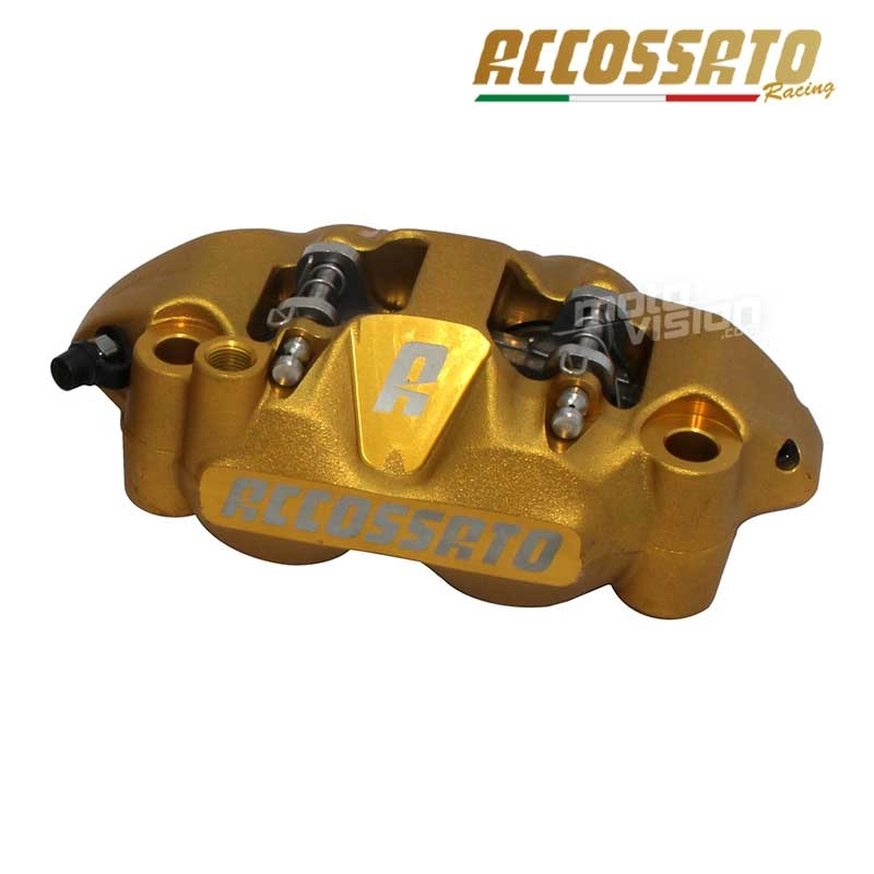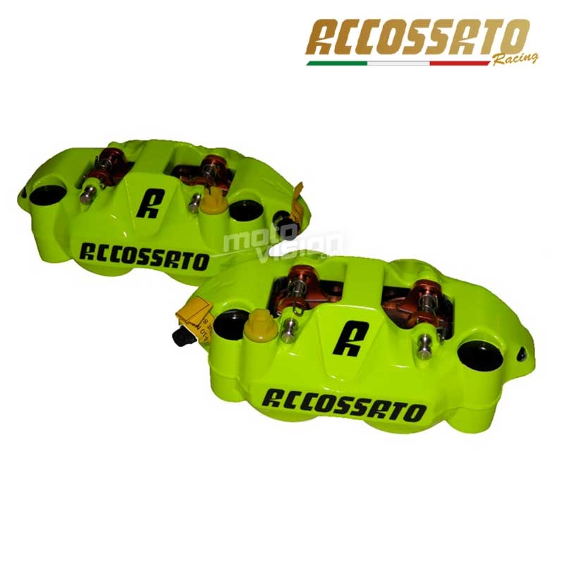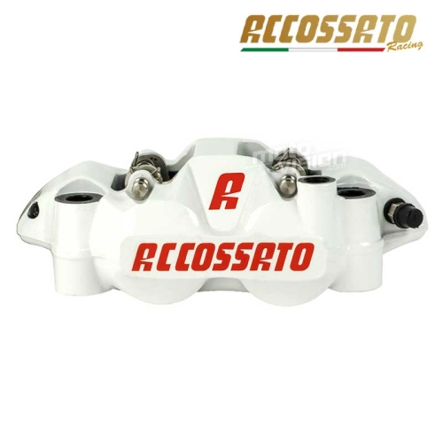 Les étriers avant radial monobloc Accossato sont vendus par paire, où à l'unité (gauche ou droite). Ils sont livrés avec des plaquettes en métal fritté de type ZXC et des caches poussières. Les étriers en aluminium forgé sont conçus pour les entraxes de 108 mm, avec 4 pistons en aluminium (34mm) et un offest de 22,5 mm.