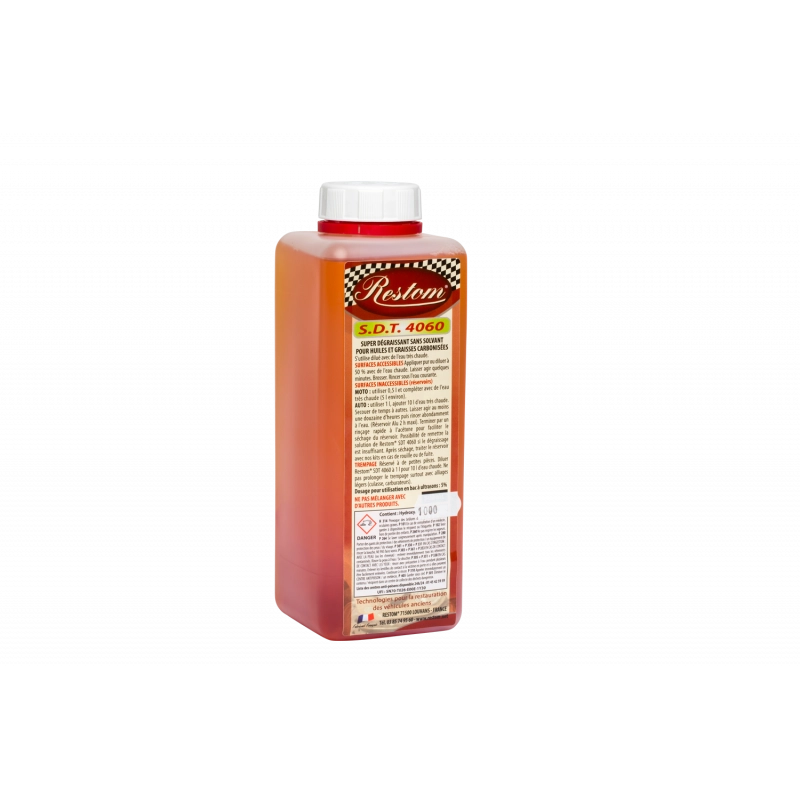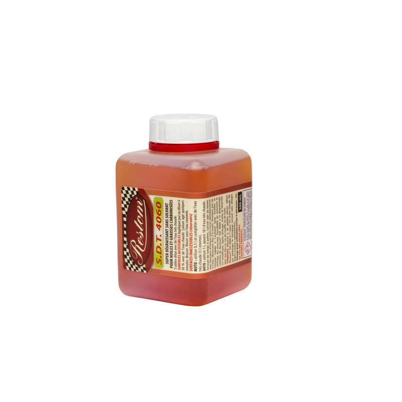 Le dégraissant Restom SDT 4060 est efficace pour les dépôts d'huiles et de carburants pour auto et moto. Ce produit est particulièrement recommandé pour dégraisser et éliminer les dépôts collants noirâtres dans les réservoirs, sans effort.