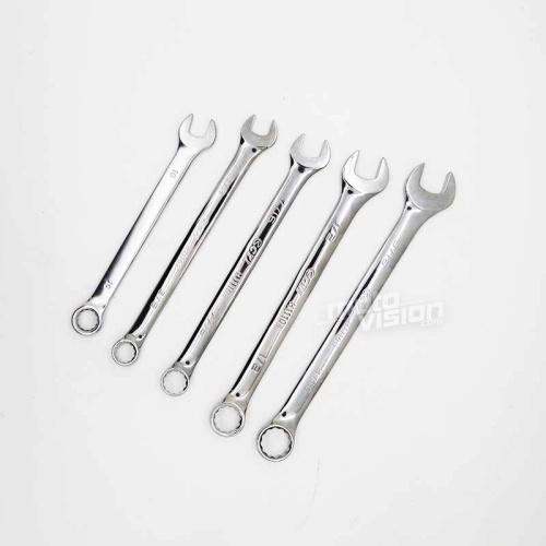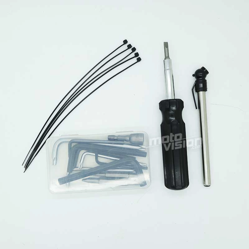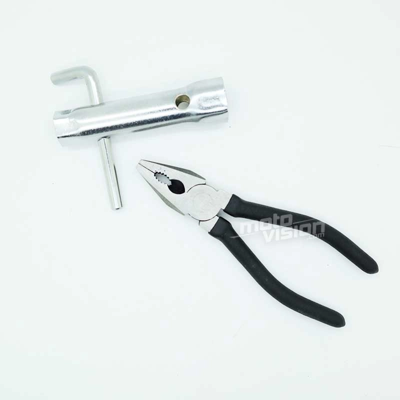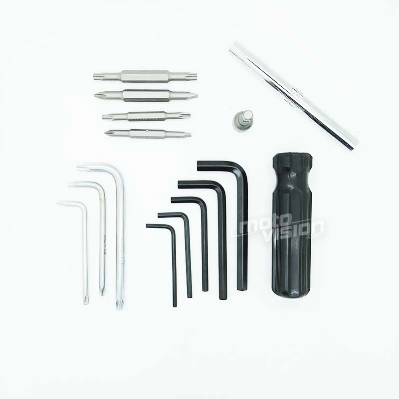Des clés mixte de 10mm, 3/8, 7/16, 1/2, 9/16 ; une pince plate ; un clé à bougie ; un tournevis multi usage avec embout PH1, PH2, V1/4, V3/16, VT25, VT30, T20, T27 ; 5 clés Allen (8, 6, 5, 4 et 3mm) ; 3 clés TORX (T27, T40) ; 5 rilesans 45.