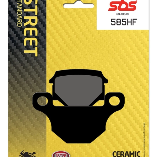 Plaquettes de frein SBS 585HF de la gamme Street Organique, idéales pour remplacer vos plaquettes d'origine afin d'obtenir un freinage stable, un haut niveau de confort, une grande durée de vie et une protection des disques dans des conditions humides et sèches pour motos et scooters.
