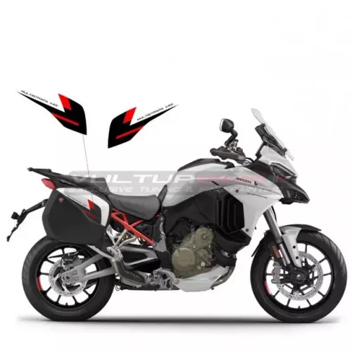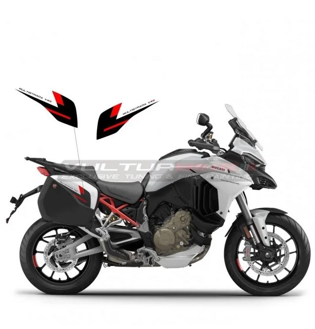 Personnalisez votre moto avec les stickers Autocollants rouges noirs pour cache-bagages w - Ducati Multistrada V4 / V4S. Les stickers adhésifs de décoration Vulturbike sont découpés dans du vinyle teinté anti UV.