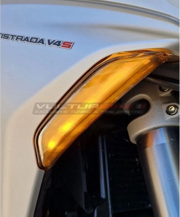 Personnalisez votre moto avec les stickers Film fumé pour clignotants - Ducati Multistrada V4. Les stickers adhésifs de décoration Vulturbike sont découpés dans du vinyle teinté anti UV.
