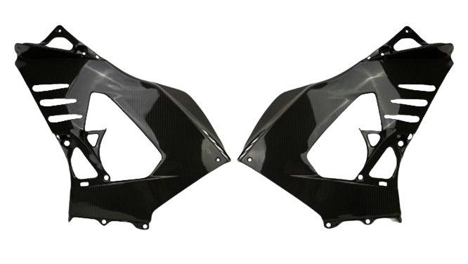 Flancs de carénage (partie intérieur) carbone Honda CBR1000RR 2020-2023, livré sans visserie ou autres fixations. Les perçages sont déjà effectués sur les carénages moto en carbone.