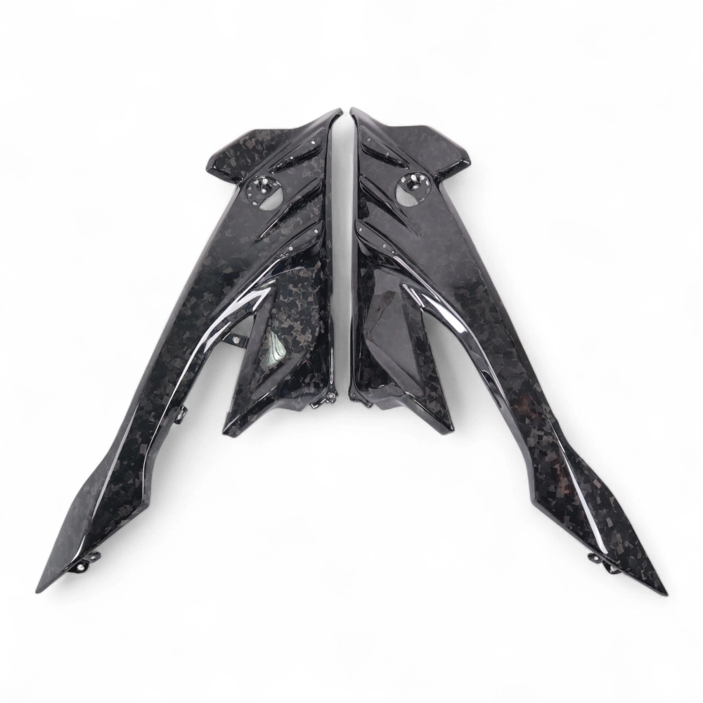 Flancs de carénage carbone BMW S1000RR 2023- à monter directement sur les points de fixation d'origine de votre moto en remplacement du carénage d'origine. Les pièces en carbone sont livrées sans visserie.