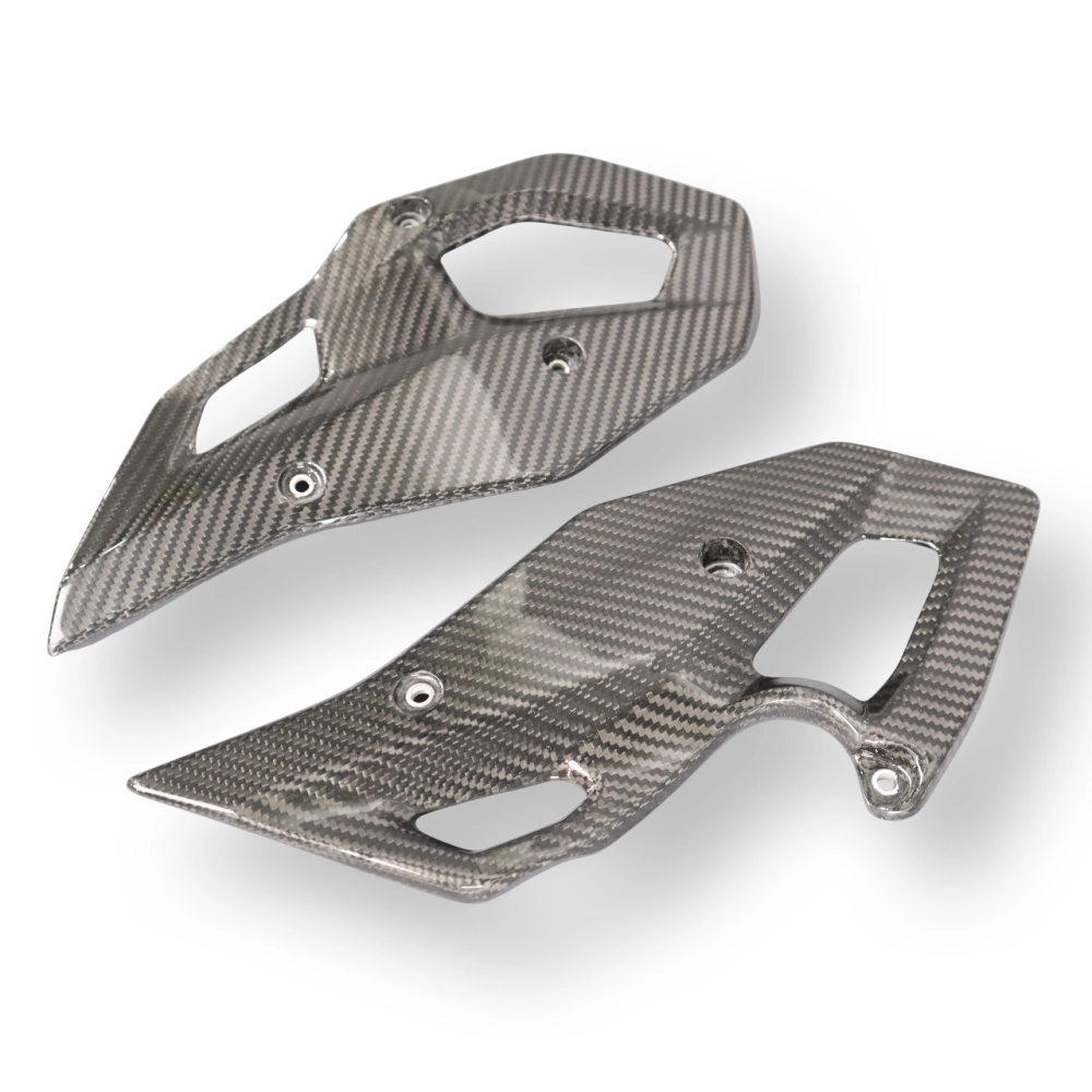 Paire de talonnette Carbone BMW R1300GS 2024- à monter directement sur les points de fixation d'origine de votre moto en remplacement du carénage d'origine. Les pièces en carbone sont livrées sans visserie.