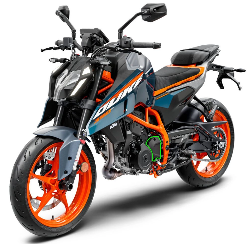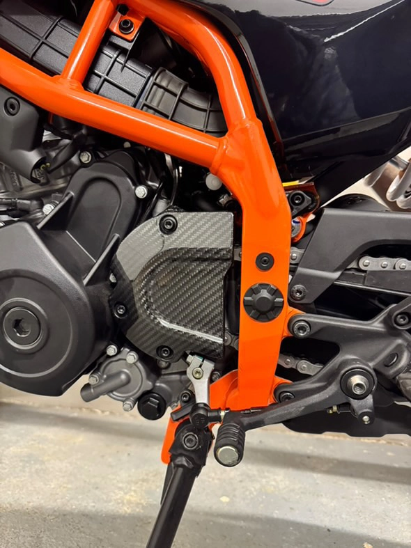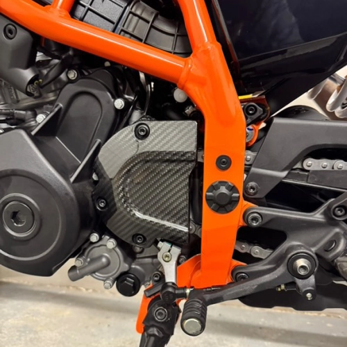 Cache pignon carbone pour KTM Duke 390 2024-, livré sans visserie ou autres fixations. Les perçages sont déjà effectués sur les carénages moto en carbone.