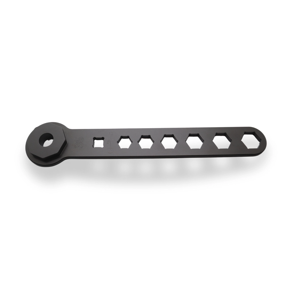 Clé de démontage de bouchons de fourche 36 mm avec renflement octogonal, spécialement conçue pour un démontage facile et précis. Cet outil garantit un travail sécurisé sans risque d’endommager les composants environnants.