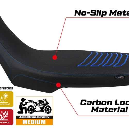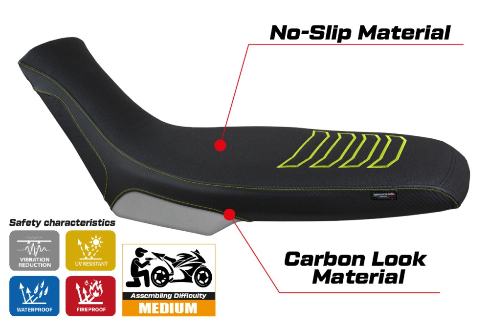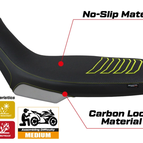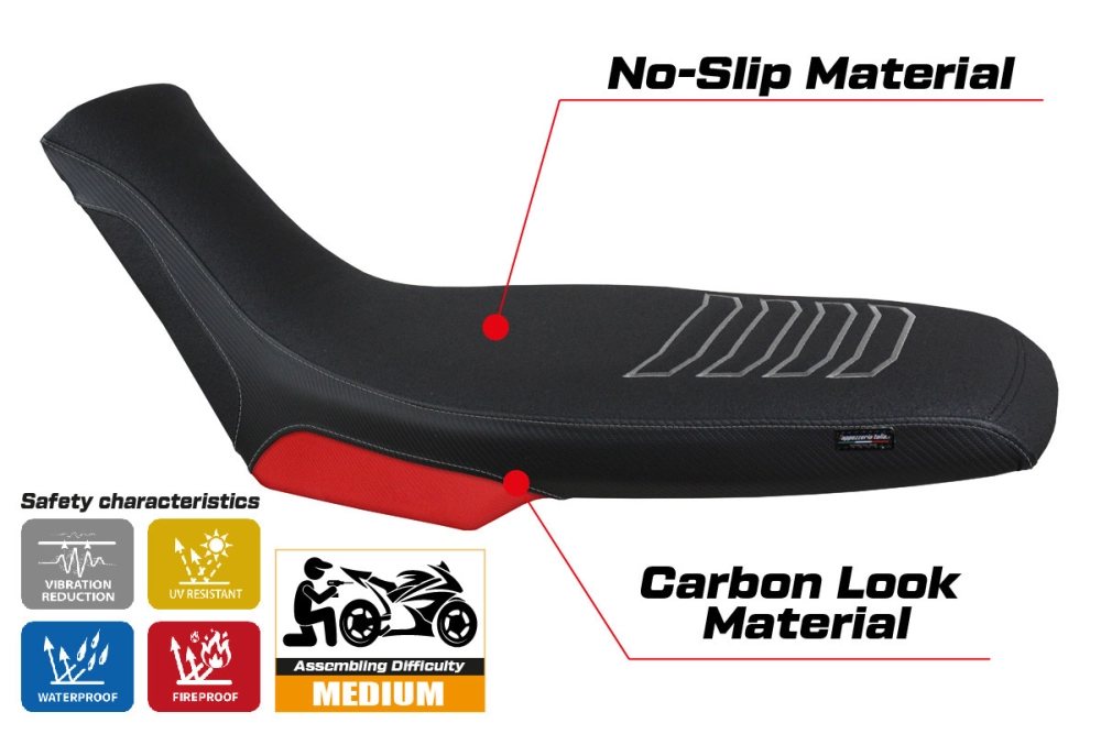 - Ultragrip : Ce type de revêtement est particulièrement adapté aux motos sportives où une plus grande adhérence sur la selle est requise. Le matériau, extrêmement poreux, est surnommé « asphalte » en raison de sa rugosité similaire à celle de la chaussée.