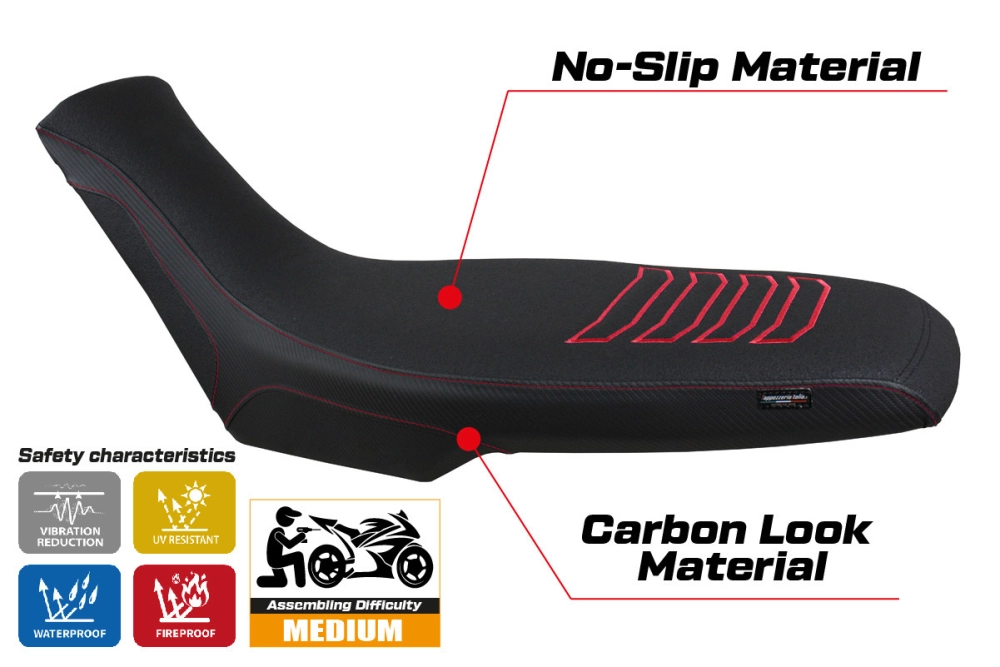 - Confortsystem : Ce revêtement est à l'extérieur exactement identique à tous les autres couvercles, mais est couplé à l'intérieur avec une couche spéciale de 2,5 cm de mousse à mémoire de forme. Tappezzeria Italia est le seul fabricant a utilisé la technologie de la Memory Foam qui permet d'améliorer le confortde conduite en réduisant la fatigue et les vibrations de la moto.