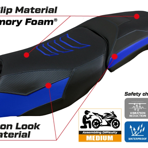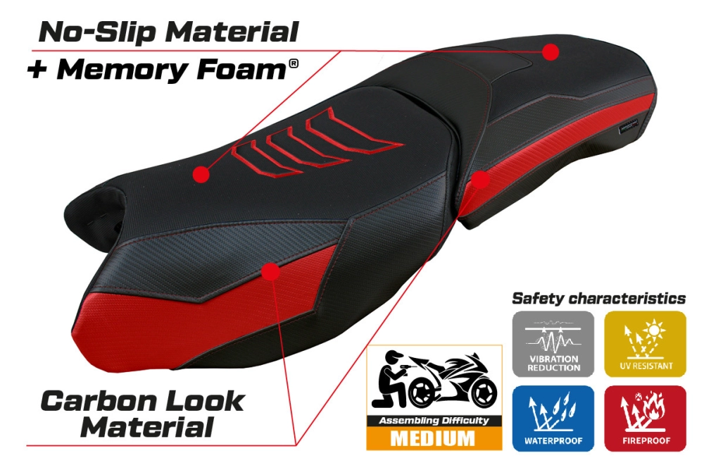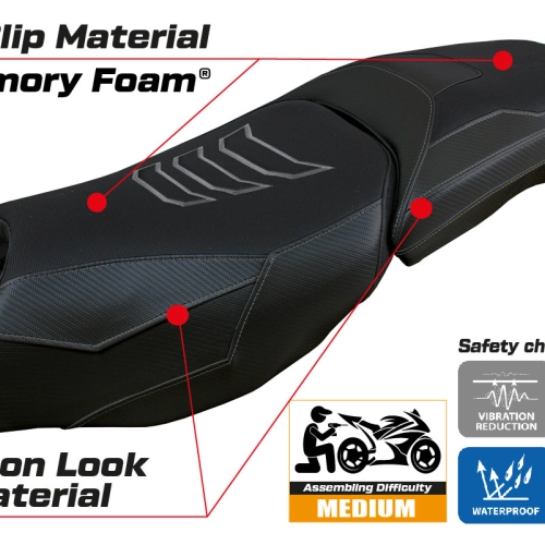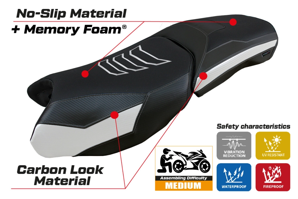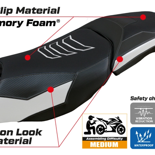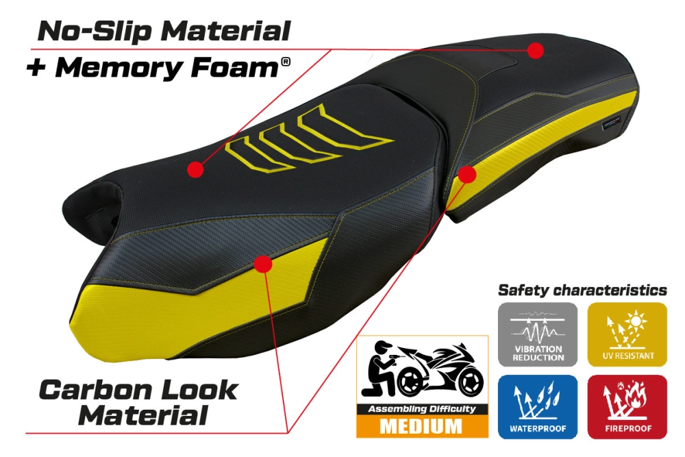 - Confortsystem : Ce revêtement est à l'extérieur exactement identique à tous les autres couvercles, mais est couplé à l'intérieur avec une couche spéciale de 2,5 cm de mousse à mémoire de forme. Tappezzeria Italia est le seul fabricant a utilisé la technologie de la Memory Foam qui permet d'améliorer le confortde conduite en réduisant la fatigue et les vibrations de la moto.