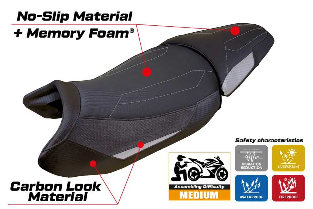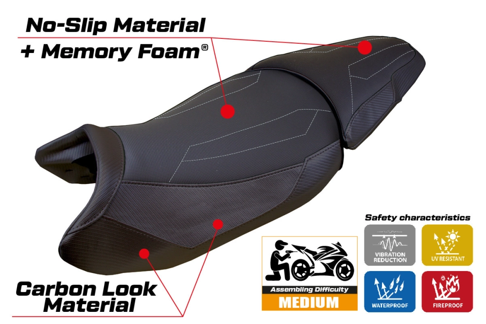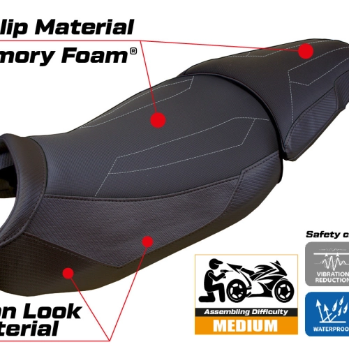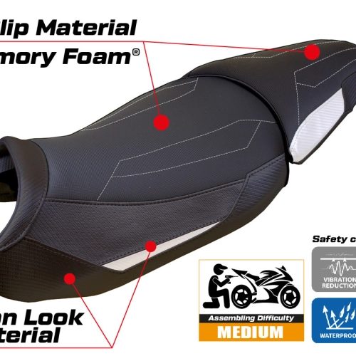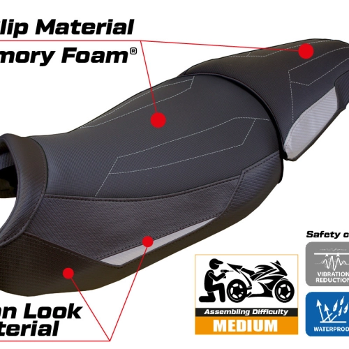 - Confortsystem : Ce revêtement est à l'extérieur exactement identique à tous les autres couvercles, mais est couplé à l'intérieur avec une couche spéciale de 2,5 cm de mousse à mémoire de forme. Tappezzeria Italia est le seul fabricant a utilisé la technologie de la Memory Foam qui permet d'améliorer le confortde conduite en réduisant la fatigue et les vibrations de la moto.